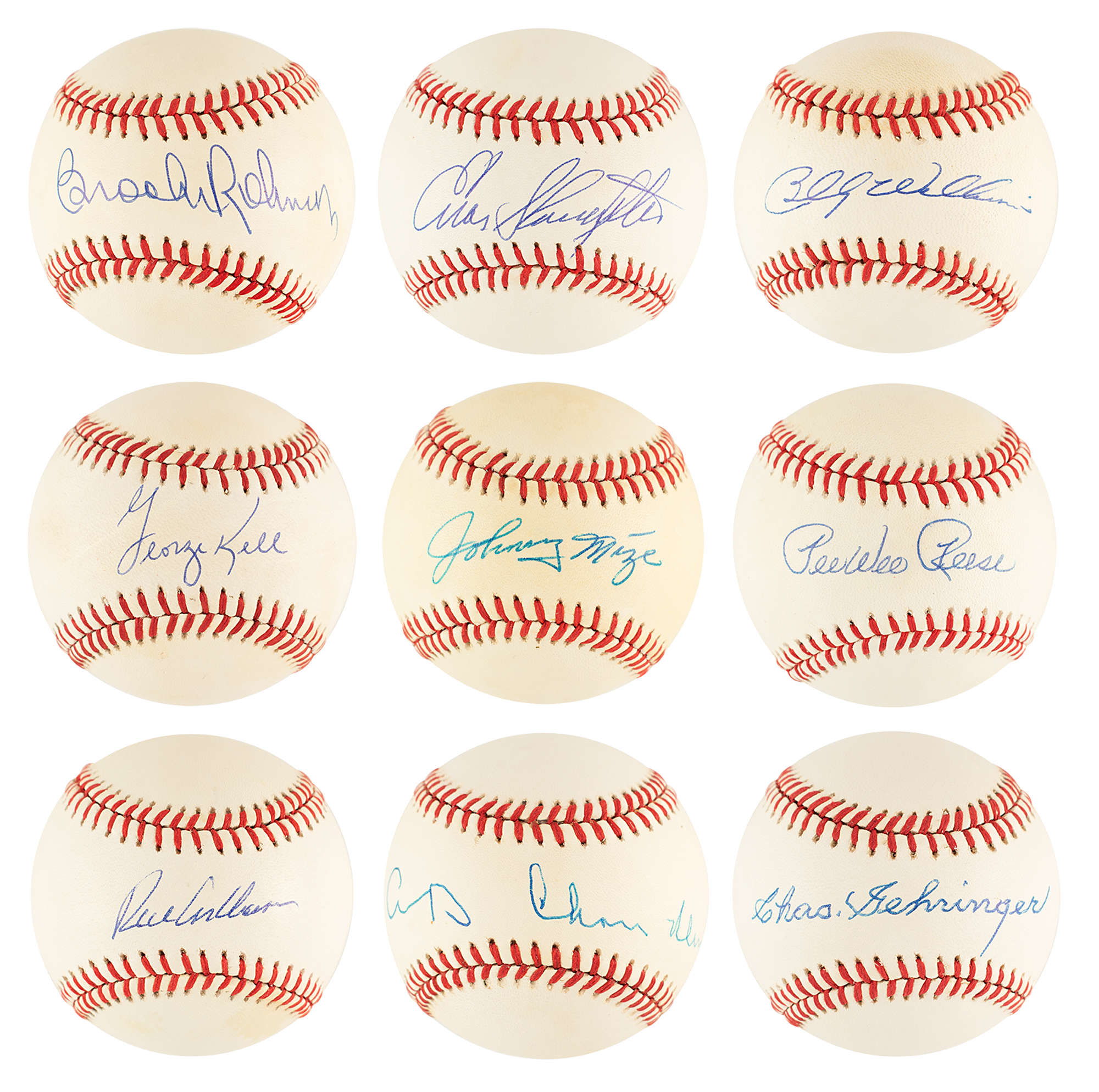 Nine official Rawlings American and National League baseballs, individually signed on the sweet spots in ballpoint by Hall of Famers. Signers are: Richie Ashburn, A. B. 'Happy' Chandler, Charles Gehringer, George Kell, Johnny Mize, Pee Wee Reese, Brooks Robinson, Enos Slaughter, and Billy Williams. In overall fine condition, with some light toning.
