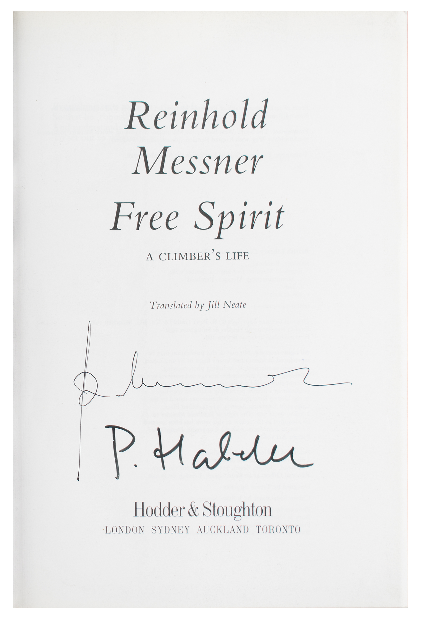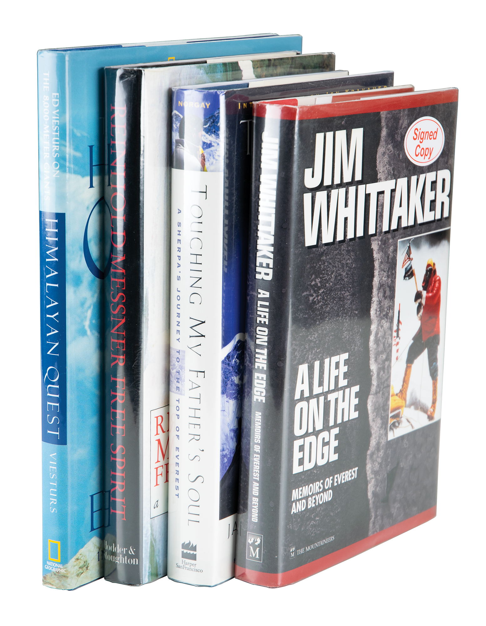 Four first edition books, all hardcover with dust jacket, each signed on an opening page in ink or felt tip by one or more world-class mountaineers, including: Reinhold Messner and Peter Habeler (Free Spirit), Jamling Tenzing Norgay (Touching My Father’s Soul), Ed Viesturs (Himalayan Quest), and Jim Whittaker (A Life on the Edge). In overall fine condition.