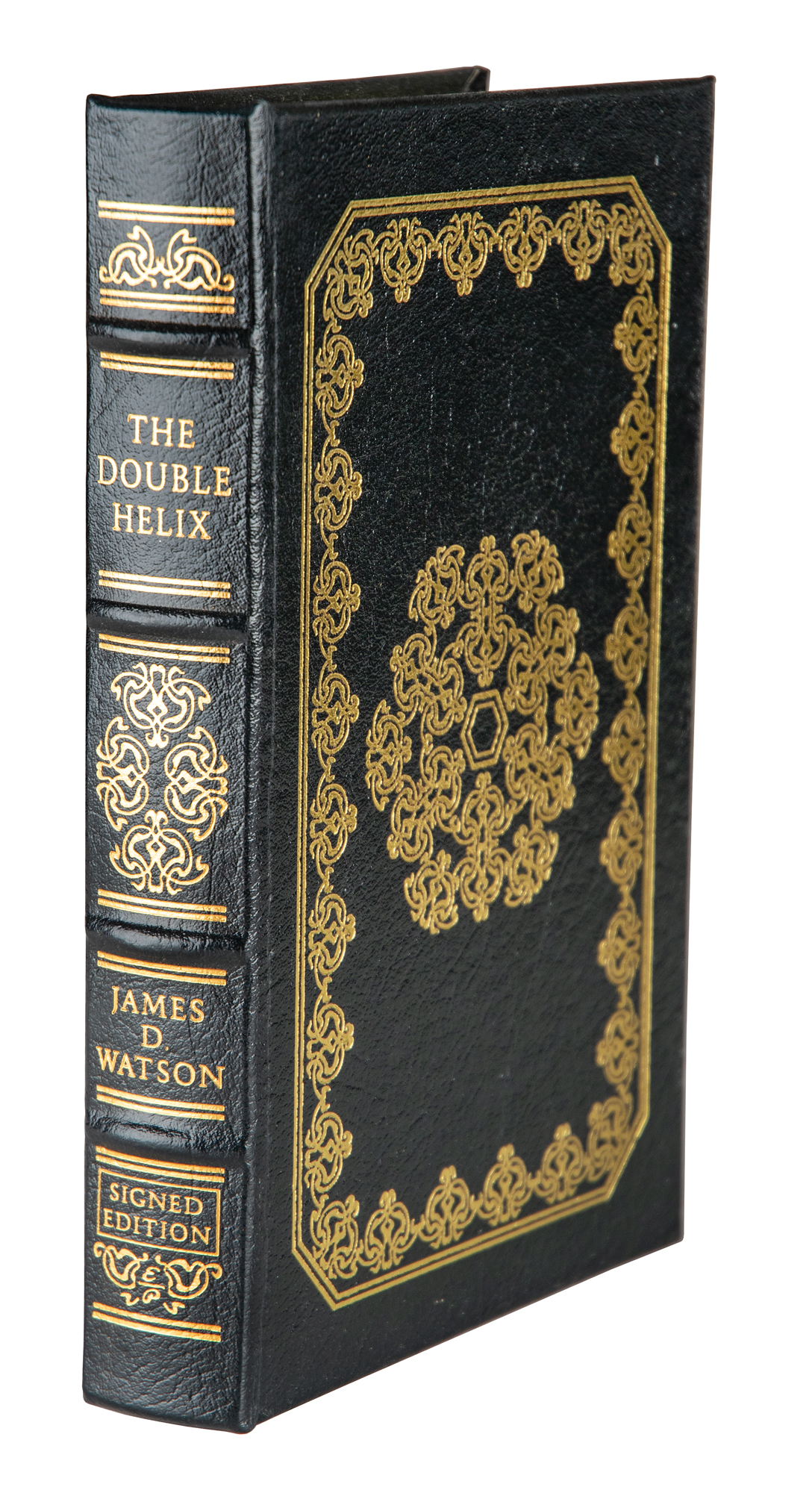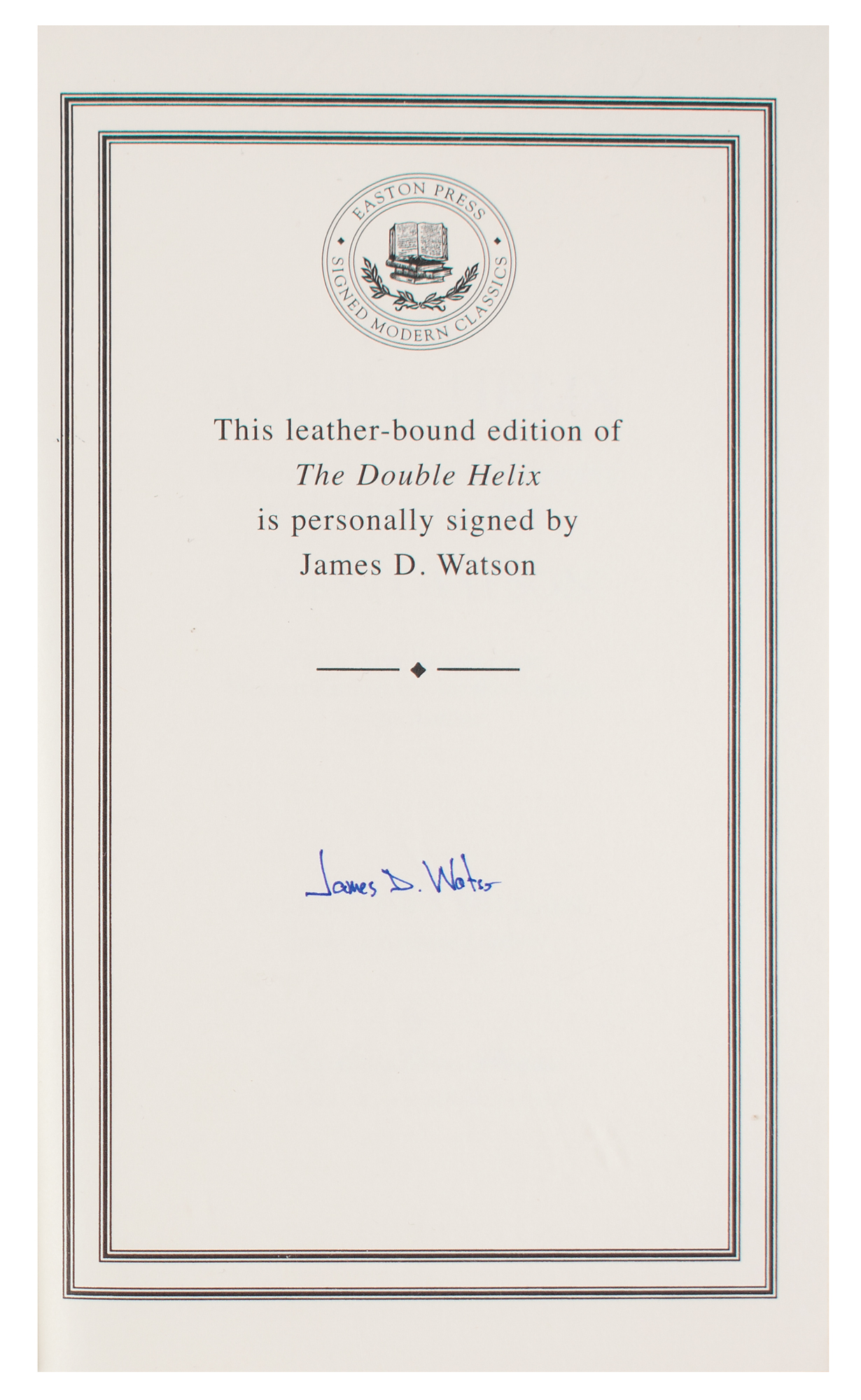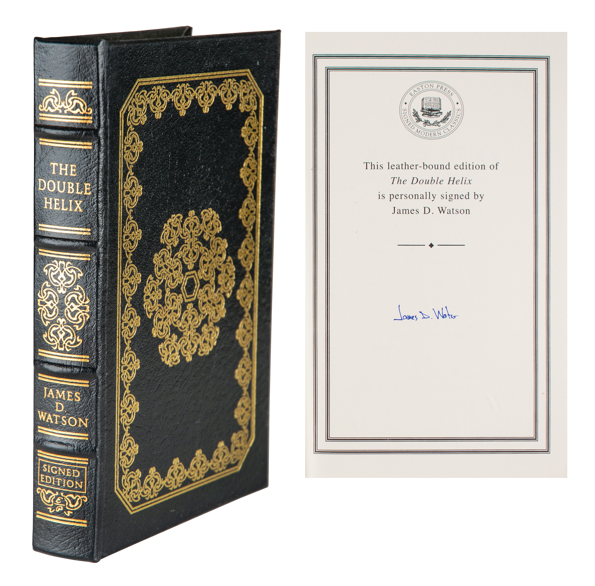 Signed book: The Double Helix. Collector's edition. Norwalk, CT: Easton Press, 2009. Leather-bound hardcover, 5.75 x 8.75, 226 pages. Signed on the colophon in blue ink by James D. Watson. In very fine condition.