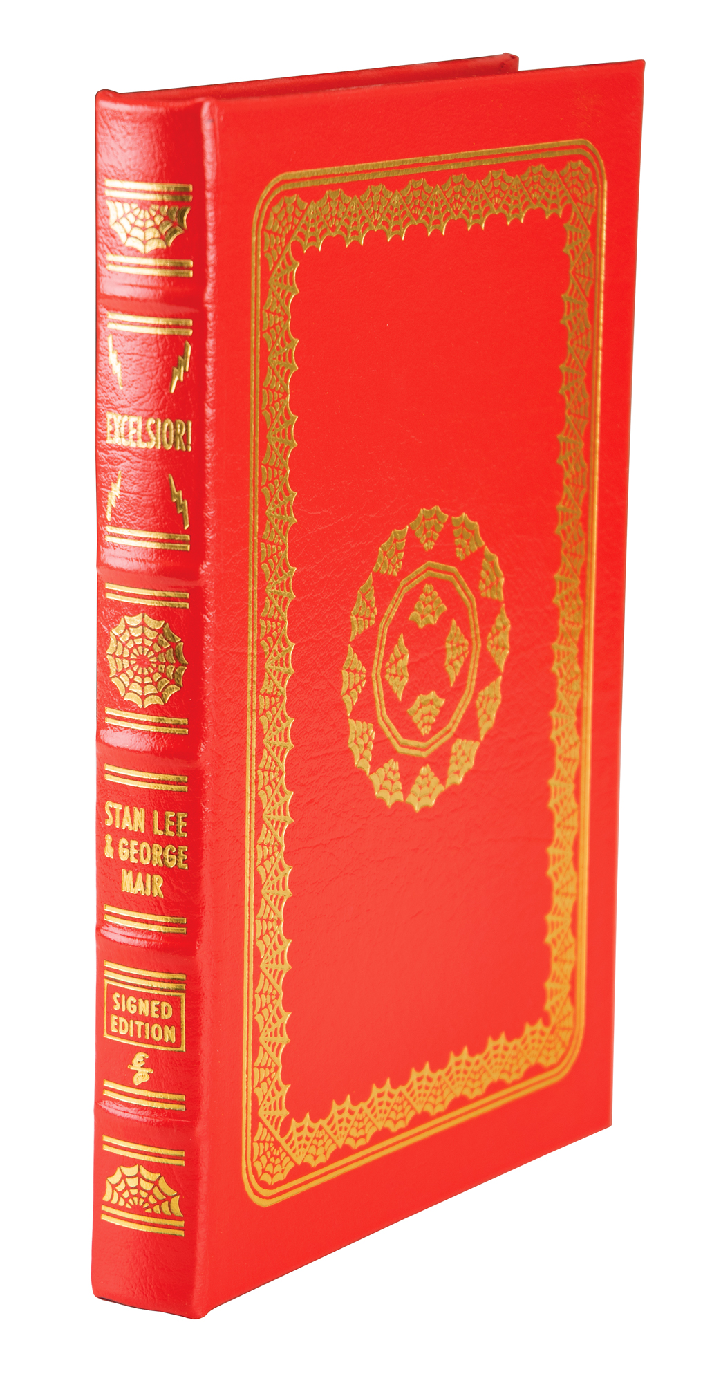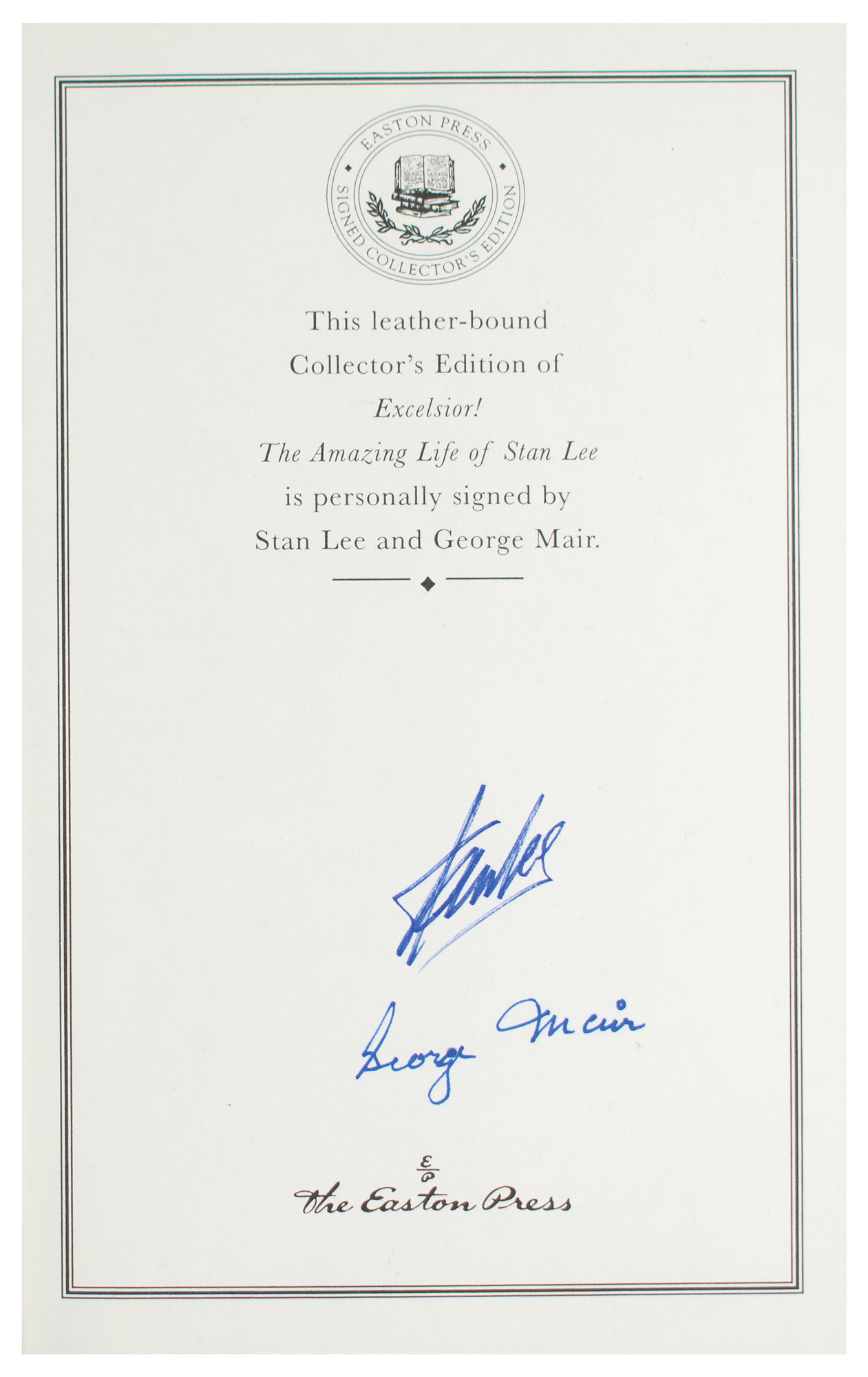 Signed book: Excelsior! The Amazing Life of Stan Lee. Collector's edition. Norwalk, CT: Easton Press, 2009. Leather-bound hardcover, 6.5 x 9.5, 246 pages. Signed on the colophon in blue felt tip by Stan Lee; the page is also signed by coauthor George Mair. In very fine condition.