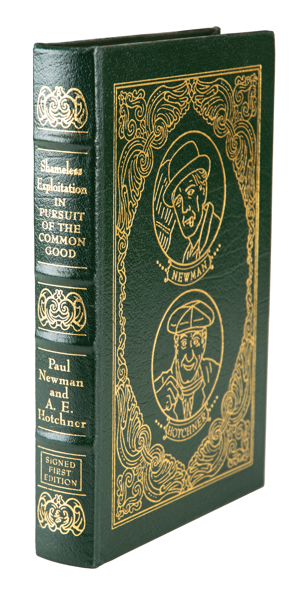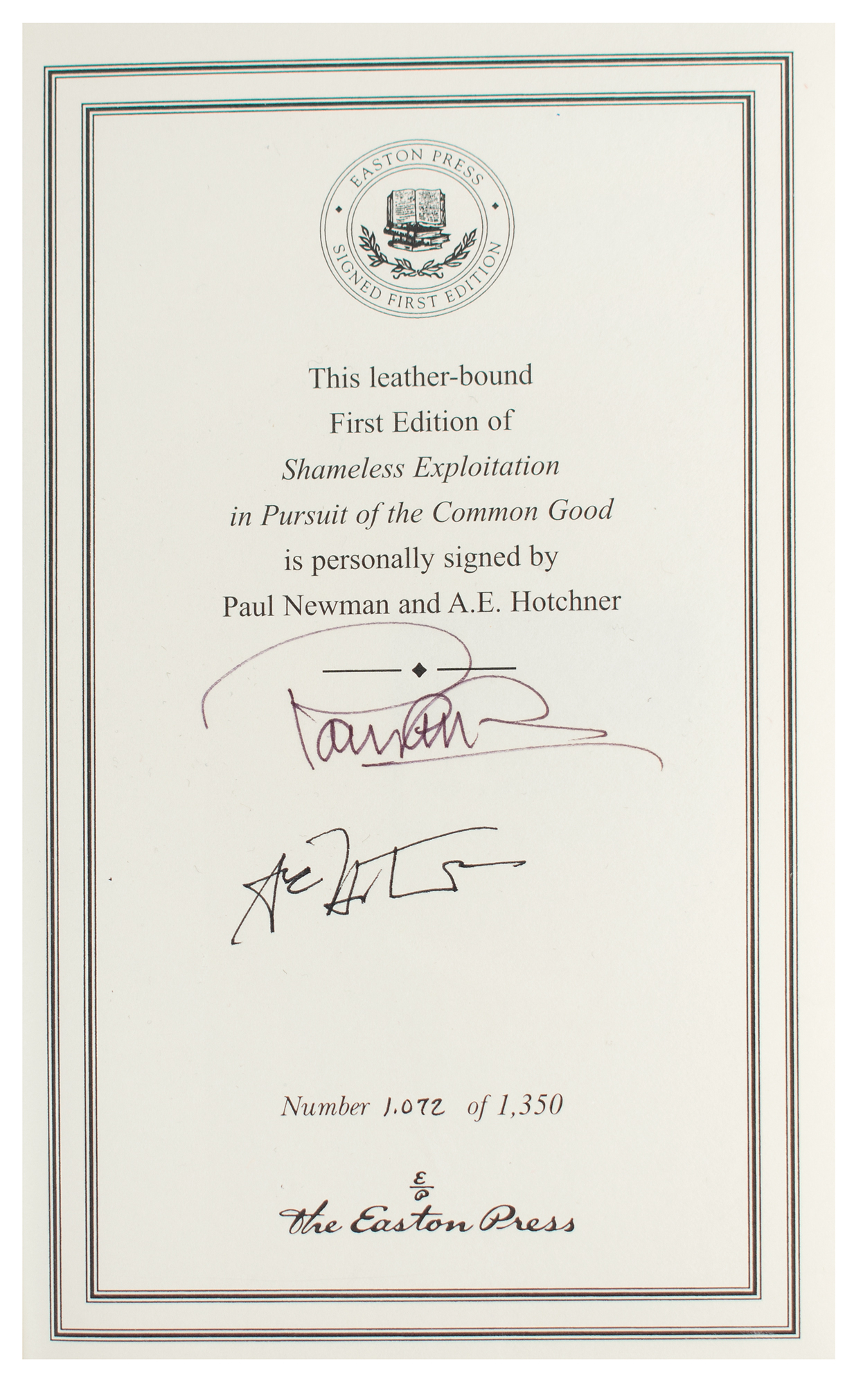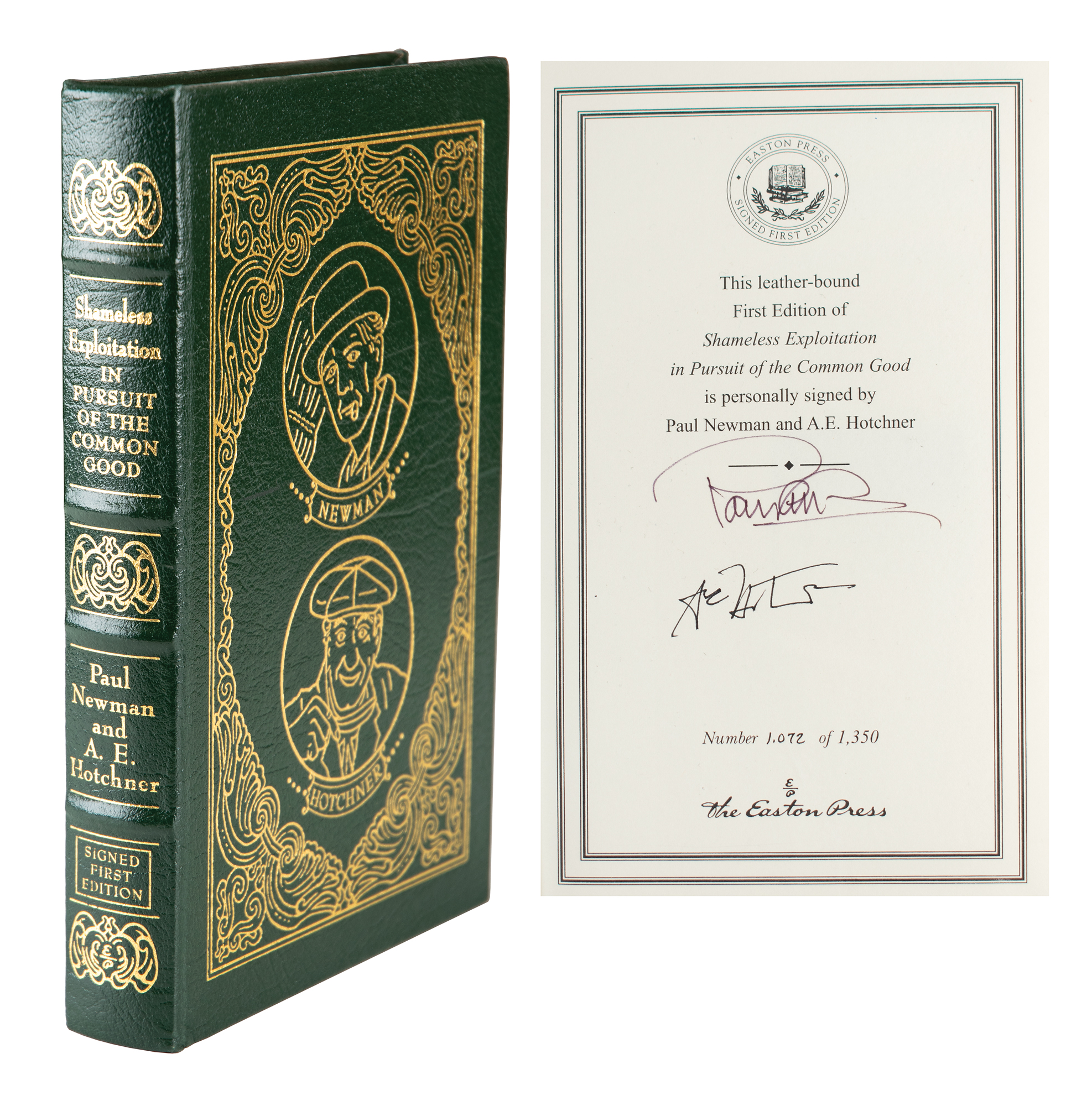 Signed book: Shameless Exploitation in Pursuit of the Common Good. Limited first edition, numbered 1072/1350. Norwalk, CT: Easton Press, 2003. Leather-bound hardcover, 6.25 x 9.25, 253 pages. Signed on the colophon in felt tip by Paul Newman and A. E. Hotchner. In very fine condition.
