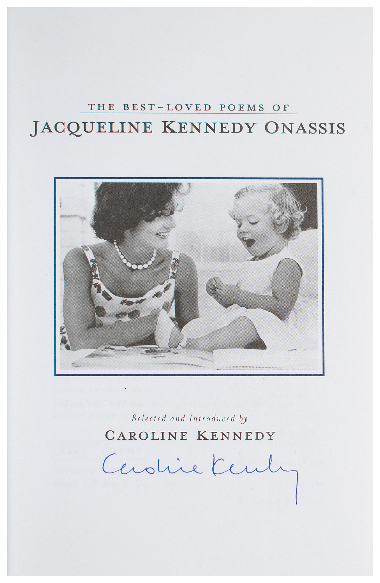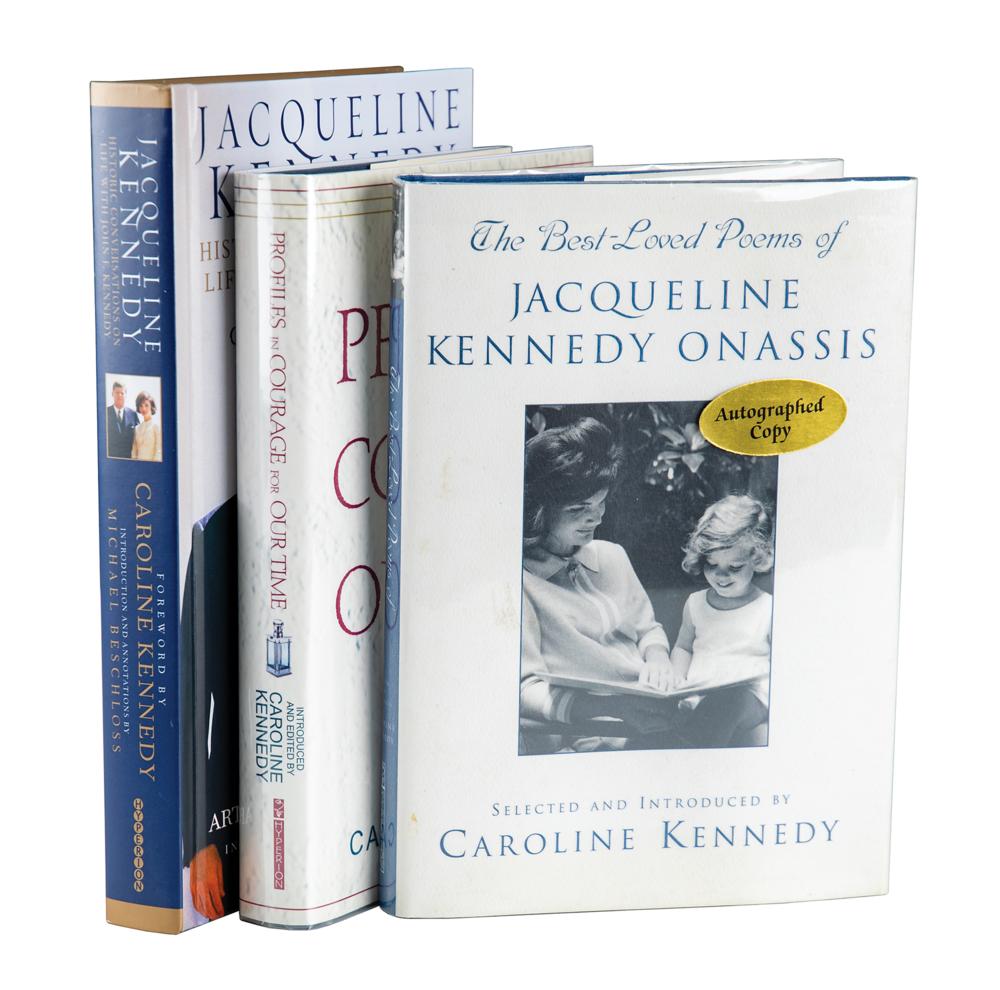 Three first edition books, all hardcover with dust jacket, each signed inside in ink or felt tip by Caroline Kennedy: The Best Loved Poems of Jacqueline Kennedy Onassis; Profiles in Courage for Our Time (signed on an affixed bookplate); and Jacqueline Kennedy: Historic Conversations on Life with John F. Kennedy (slipcase with 7 of 8 CDs; missing 4th). In overall fine condition.