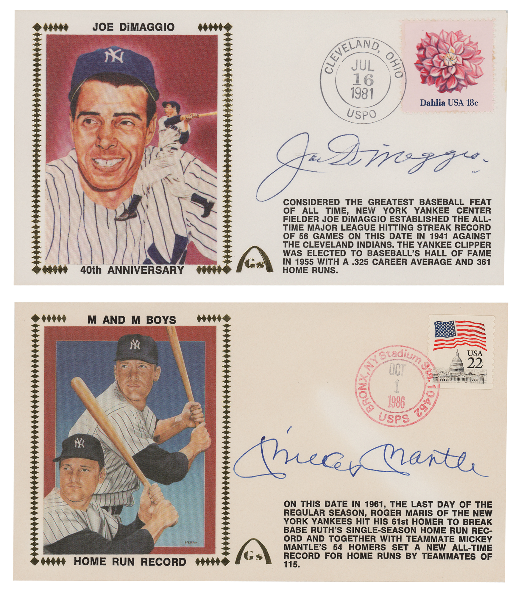 Two Gateway covers with silk color cachets honoring the New York Yankees legends, individually signed in blue ballpoint, "Mickey Mantle" and "Joe DiMaggio." In overall fine condition, with mild toning to the Mantle cover.