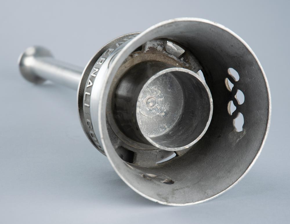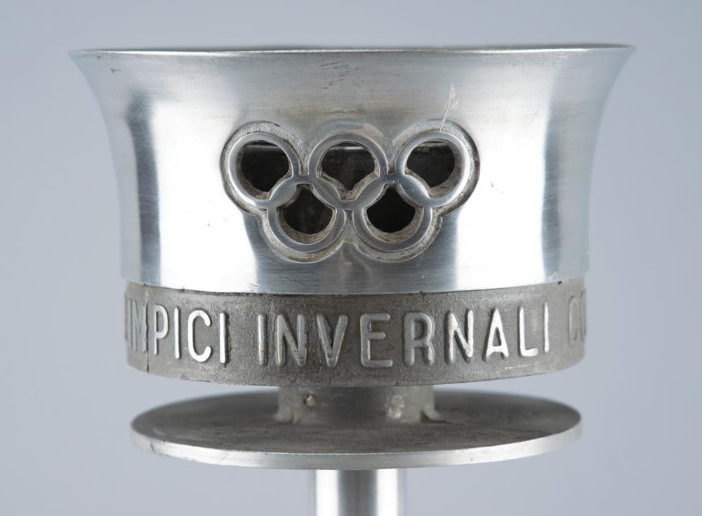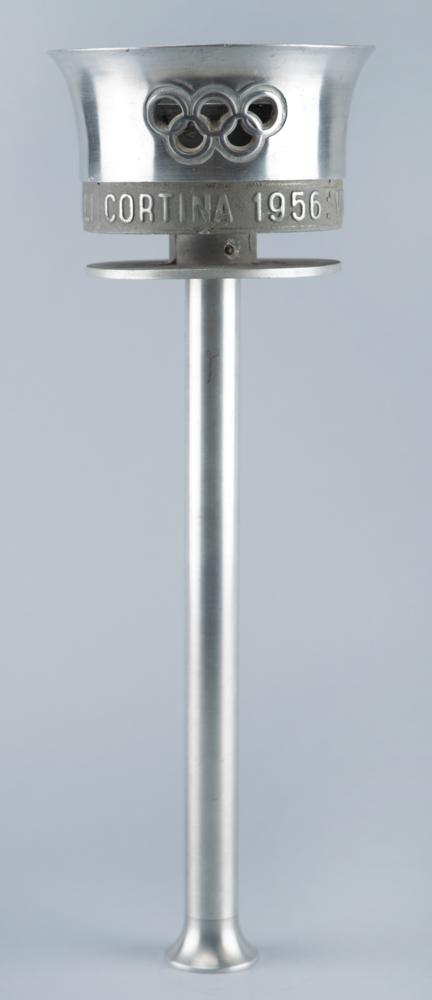 Official 1956 Cortina Winter Olympics torch, constructed of silver-colored metal, measuring 16.25″ in length and 5.5″ at its widest point, designed by Ralph Lavers. The torch was modeled after the one used for the 1948 London Olympics and the 1956 Melbourne Olympics, with the upper part in the shape of a cauldron with three ‘cut-outs’ of the Olympic rings, encircled below by the inscription, “VII Giochi Invernali Cortina 1956.” Exhibits some minor adhesive residue to underside.