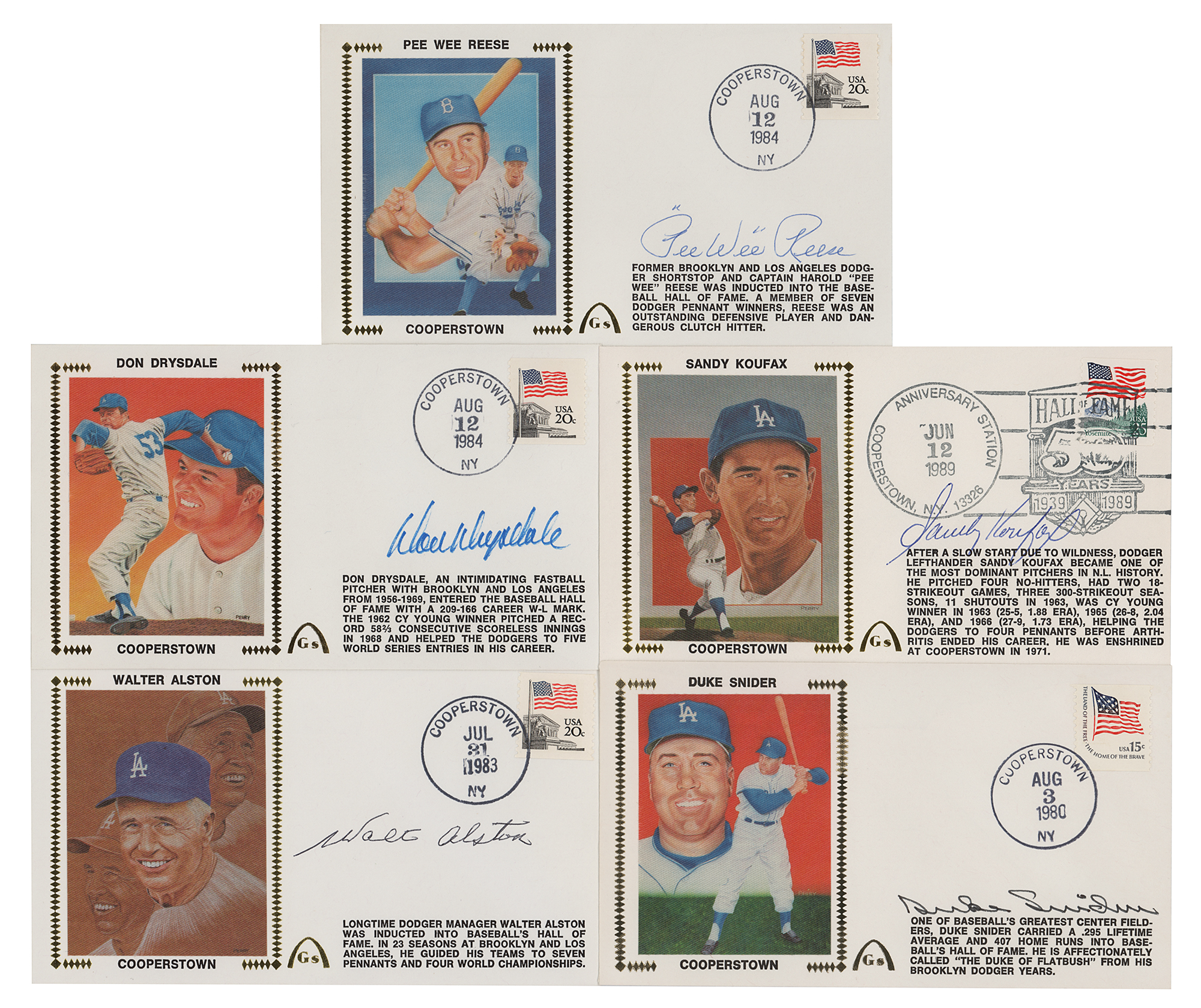 Five Gateway covers with silk color cachets honoring the induction of Brooklyn and Los Angeles Dodgers legends into the Baseball Hall of Fame, individually signed in ink by Sandy Koufax, Don Drysdale, Duke Snider, Pee Wee Reese, and Walt Alston. In overall fine condition.