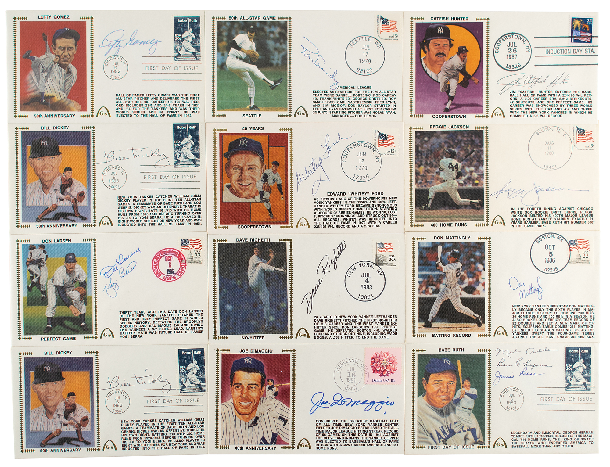 Twelve Gateway covers with silk color cachets honoring New York Yankees legends, each signed in ink by one or more Bronx greats. Signers are: Joe DiMaggio; Whitey Ford; Reggie Jackson; Yogi Berra and Don Larsen; Mel Allen, Ben Chapman, and Jimmie Reese; Dave Righetti; Don Mattingly; Ron Guidry; Jim 'Catfish' Hunter; Bill Dickey (2); and Lefty Gomez. In overall fine condition.
