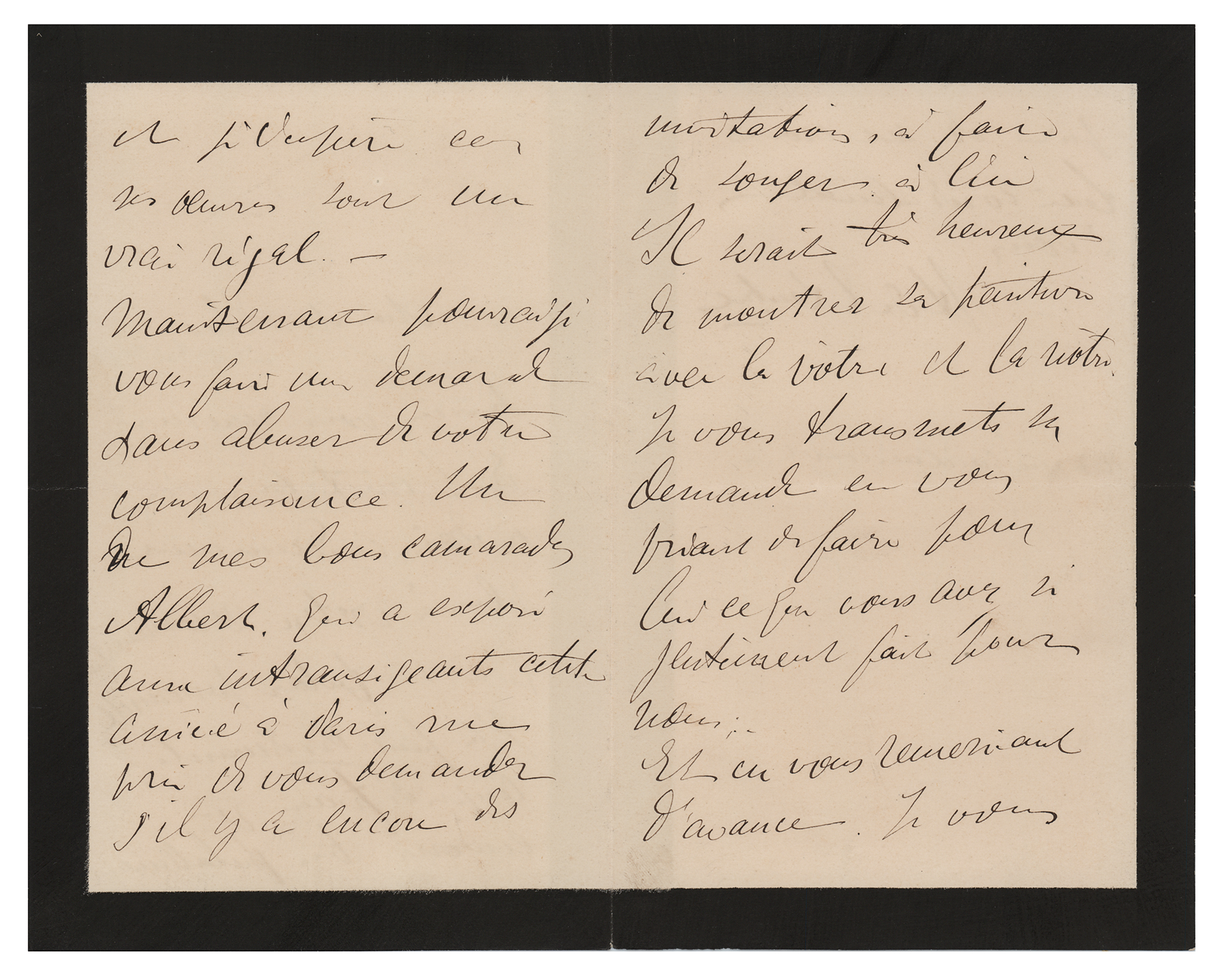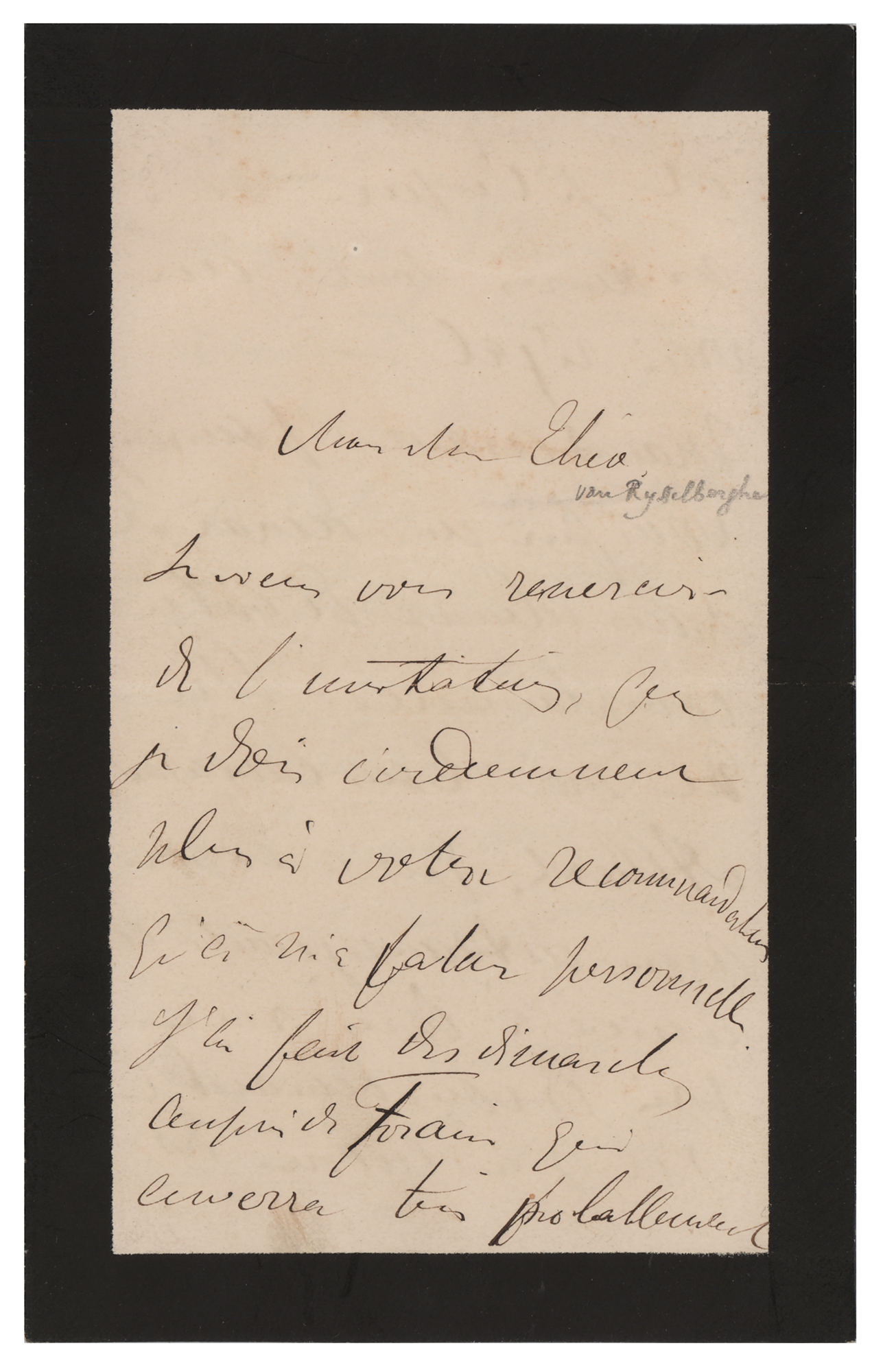 ALS in French, signed “H. de T. Lautrec,” four black-bordered pages on two adjoining sheets, 4.5 x 7, no date [November 1887, Paris]. Handwritten letter to the Belgian neo-impressionist painter Theo van Rysselberghe, in part (translated): "I want to thank you for the invitation that I owe obviously a lot more to your recommendation than to my own worth. I have urged Forant to send things to you most probably and I hope so because his work is a real delight. Now I must ask to make a request without wanting to exaggerate or to count too much on your kindness. One of my good comrades Albert Adolphe who has shown at the exhibition of the eintransigeants in Paris has asked me to ask you if there is still some room for new invitations and please think about it. He would be very happy to show his painting with yours and mine. I send you his request asking to do for him what you have done so kindly for us all. Now to thank you in advance. I ask you to believe me very cordially yours." Lautrec also adds his address. In fine condition. An exquisite letter from Lautrec, unknown at the time and flattered by Van Rysselberghe's invitation to a popular Parisian exhibition. Most letters from Latrec are directed to his mother, with this uncommon, beautifully signed example, which boasts wonderful artistic connections, the first of a recorded 10 sent to Van Rysselberghe.