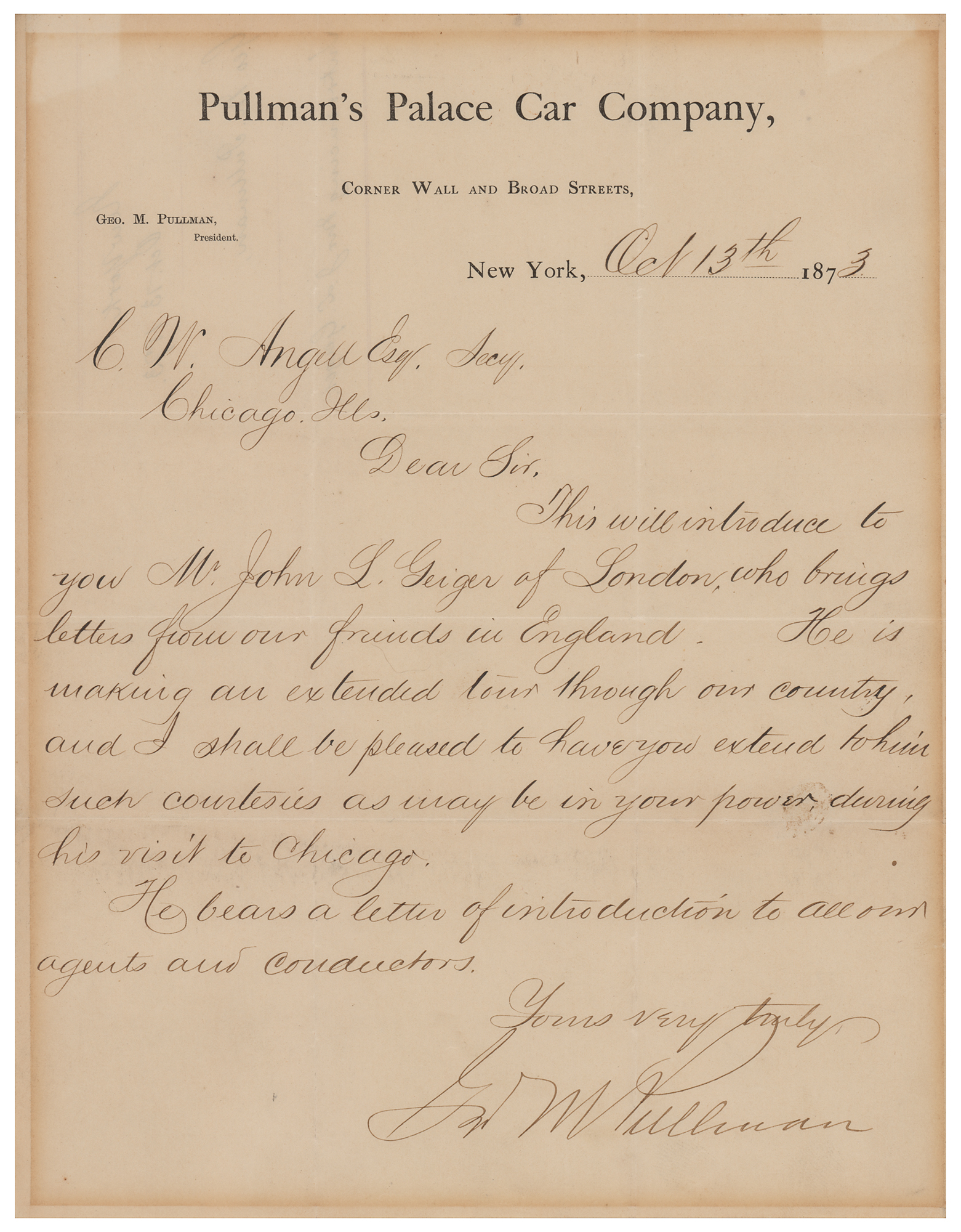 LS signed “Geo. W. Pullman,” one page, 8 x 10.5, Pullman's Palace Car Company letterhead, October 13, 1873. Letter to C. W. Angell, in full: "This will introduce to you Mr. John L. Geiger of London, who brings letters from our friends in England. He is making an extended tour through our country, and I shall be pleased to have you extend to him such courtesies as may be in your power during his visit to Chicago. He bears a letter of introduction to all our agents and conductors." In fine condition, with toning from prior display.