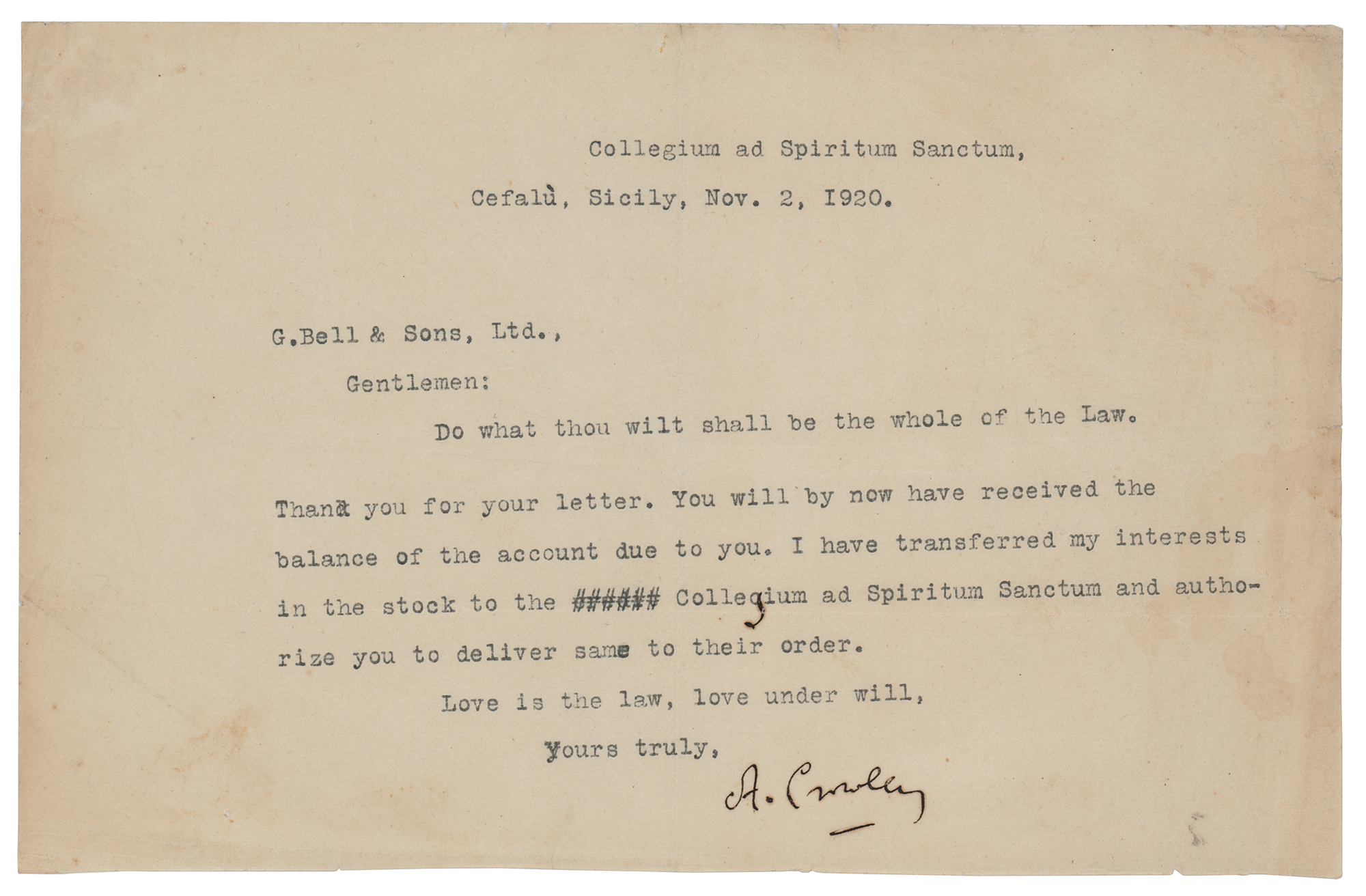 English occultist, ceremonial magician, painter, mountaineer, and prolific writer (1875-1947) who founded the religion of Thelema, identifying himself as the prophet entrusted with guiding humanity into the Æon of Horus in the early 20th century. TLS signed “A. Crowley,” one page, 9 x 5.75, November 2, 1920. Written from the Collegium ad Spiritum Sanctum in Cefalu, Sicily, a letter to the publishing house George Bell & Sons, in full: "Do what thou wilt shall be the whole of the Law. Thank you for your letter. You will by now have received the balance of the account due to you. I have transferred my interests in the stock to the Collegium ad Spiritum Sanctum and authorize you to deliver same to their order. Love is the law, love under will." In very good to fine condition, with scattered light staining and creasing.