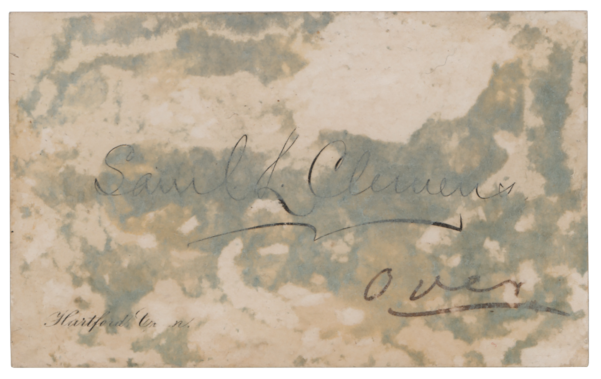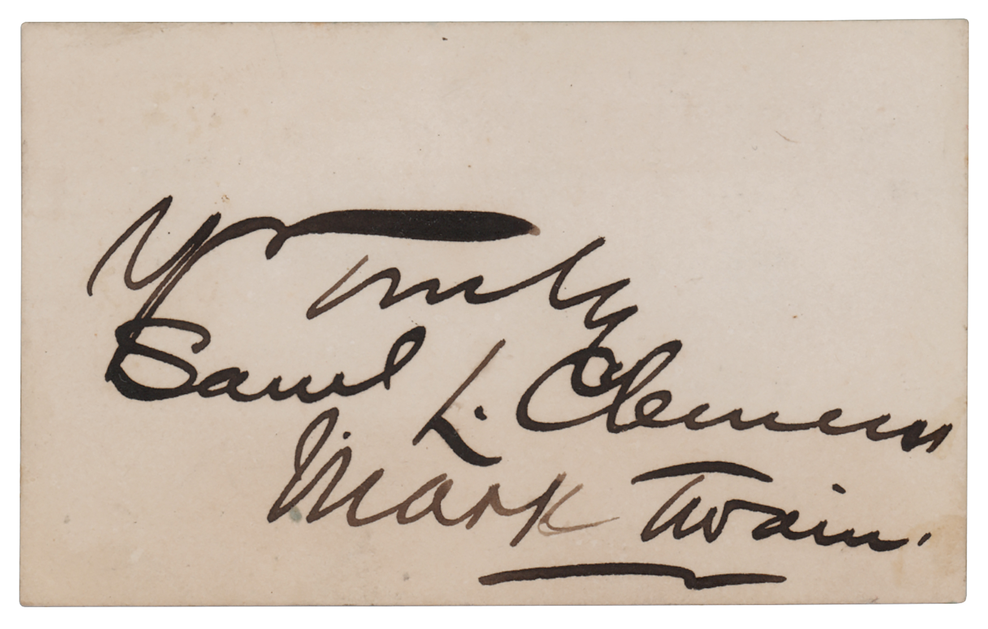 Bold fountain pen signature, "Yrs truly, Sam'l L. Clemens, Mark Twain,” on the reverse of an off-white 3.5 x 2 calling card. In fine condition, with heavy staining to the back. A desirable twice-signed example.
