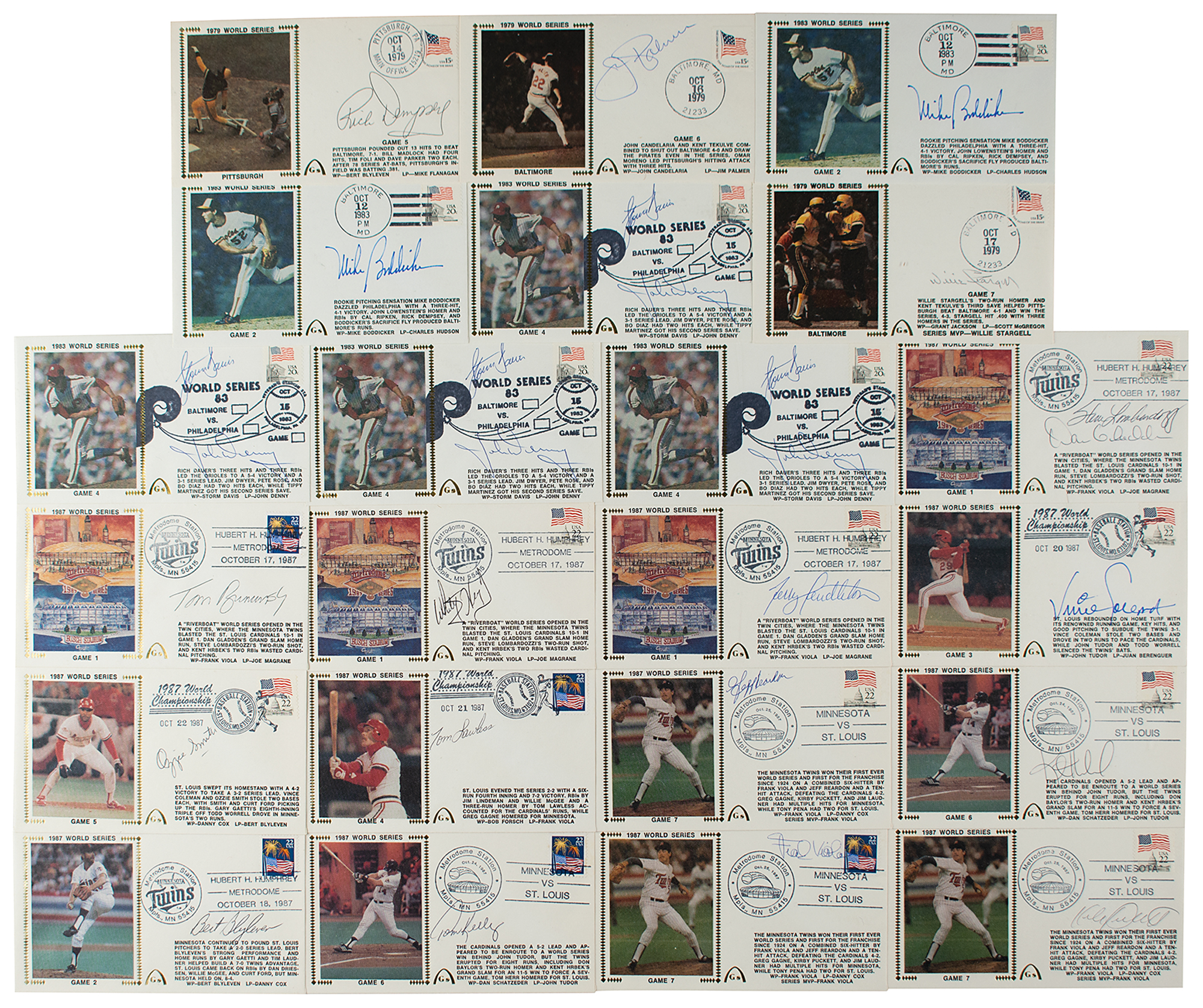 Collection of 22 Gateway covers with silk cachets honoring defining moments of the 1979, 1983, and 1987 World Series, each signed in ink by one or more of the leading participants. Signers include: Willie Stargell; Jim Palmer; Rick Dempsey; Mike Boddicker (2); Storm Davis and John Denny (4); Steve Lombardozzi and Dan Gladden; Tom Brunansky; Whitey Herzog; Terry Pendleton; Vince Coleman; Ozzie Smith; Bert Blyleven; Tom Lawless; Jeff Reardon; Kent Hrbek; Tom Kelly; Frank Viola; and Kirby Puckett. In overall fine condition. Accompanied by 18 unsigned Gateway covers associated with the same three Fall Classics.