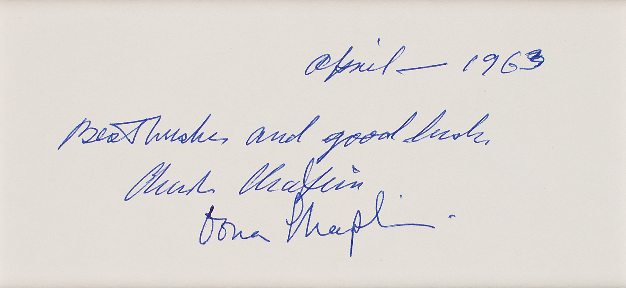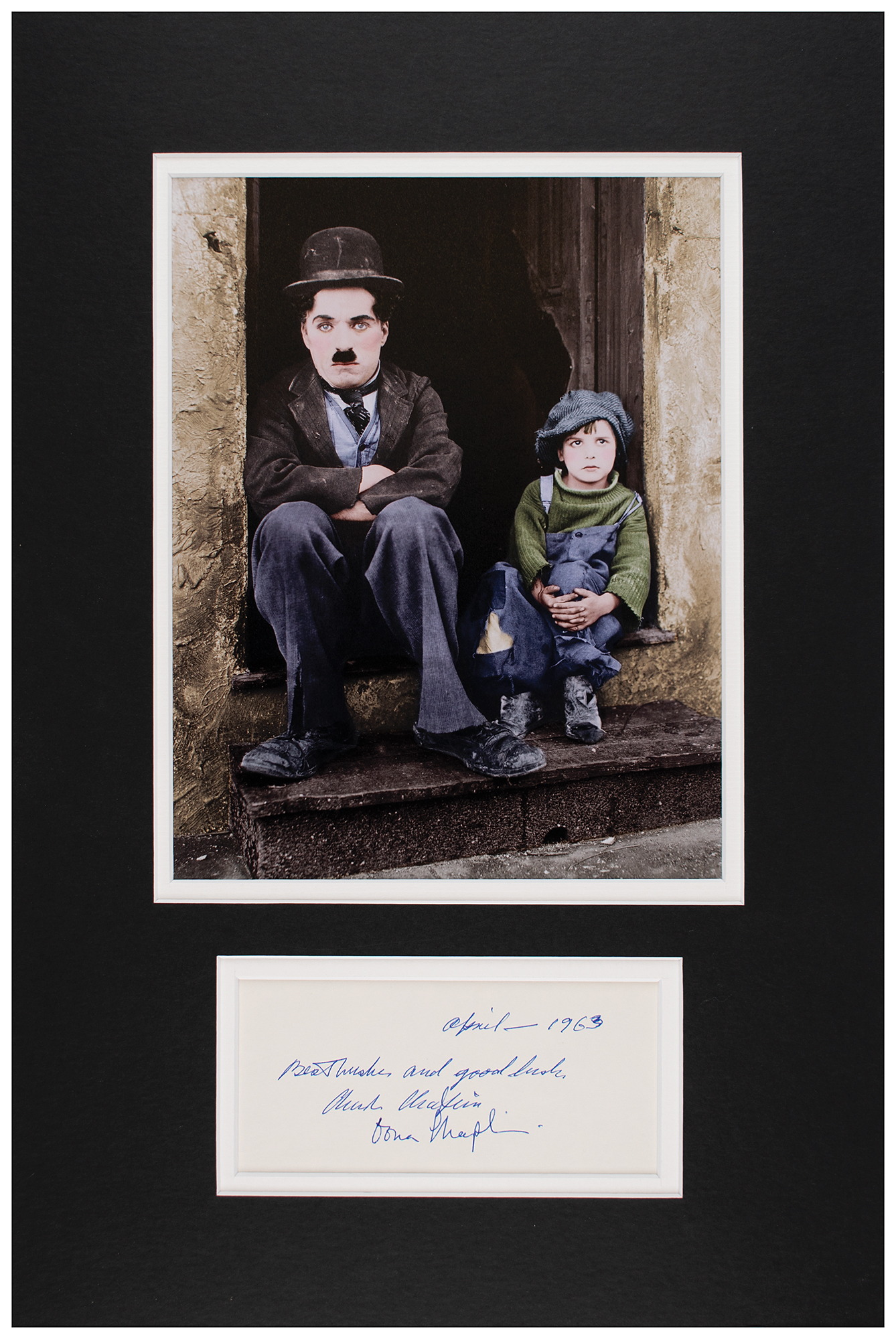 Vintage ballpoint signatures, "Best wishes and good luck, Charlie Chaplin, April-1963" and "Oona Chaplin," on an off-white 5.75 x 2.75 sheet. Double-matted with a color photo of Chaplin as his iconic Tramp character to an overall size of 12 x 18. In very fine condition.