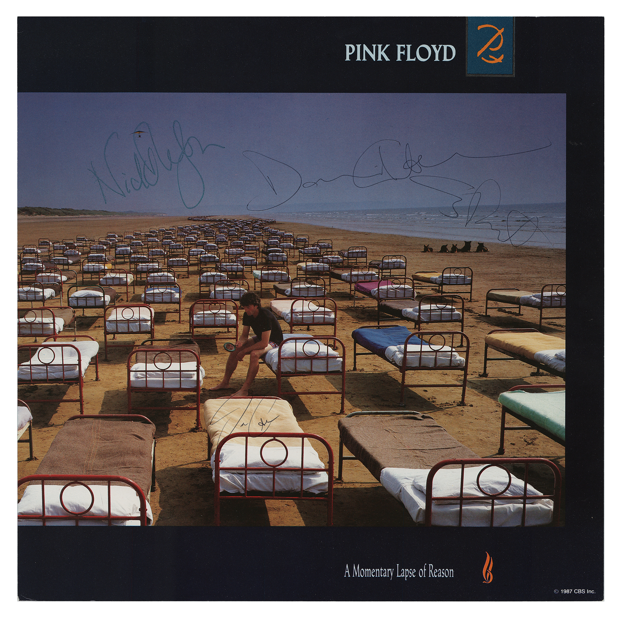 Album flat for the Pink Floyd record A Momentary Lapse of Reason, signed in blue ink by Nick Mason, and in black ballpoint by David Gilmour, Jon Carin, and Guy Pratt. In fine condition. The record is not included.