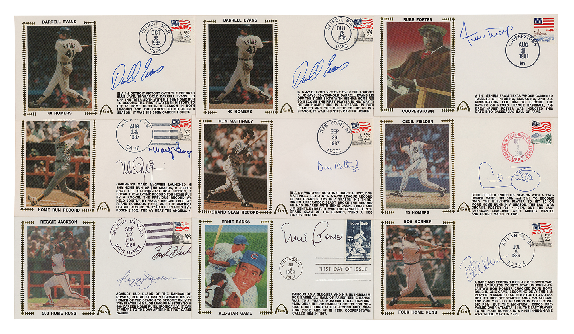 Nine Gateway covers with silk color cachets honoring baseball legends, each signed by one or more legendary sluggers. Signers are: Willie Mays; Ernie Banks; Reggie Jackson and Bud Black; Mark McGwire and Wally Berger; Don Mattingly; Darrell Evans (2); Bob Horner; and Cecil Fielder. In overall fine condition.
