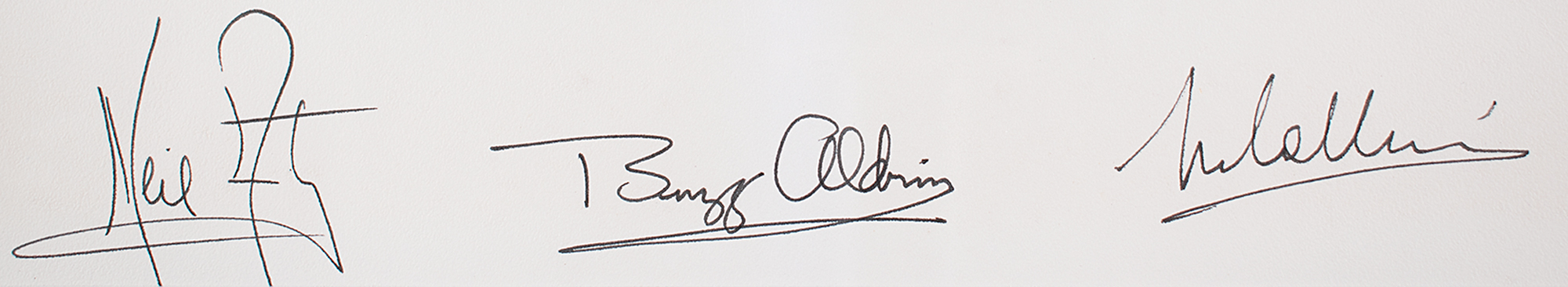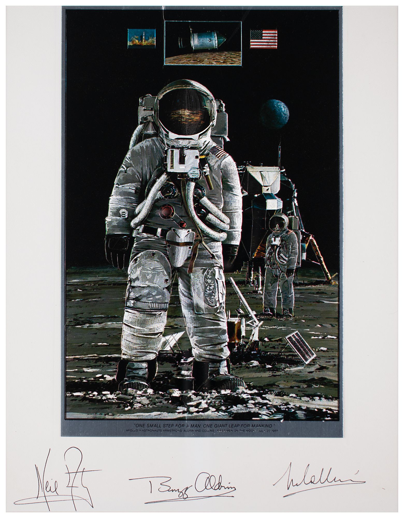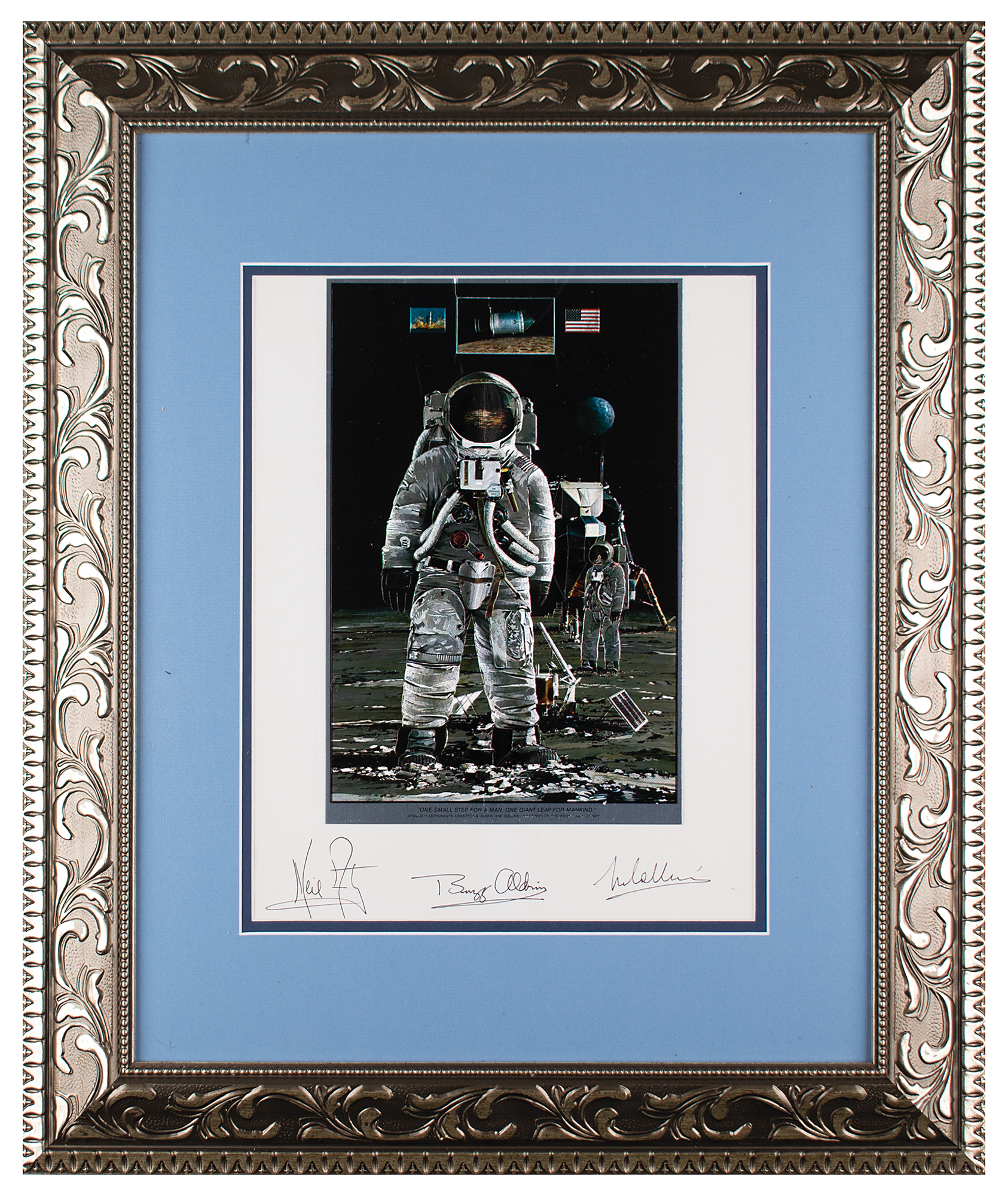 Sought-after color 7.5 x 11.25 foil etch reproduction of a John Berkey painting entitled 'One Giant Leap,' which depicts Neil Armstrong standing on the surface of the moon, with Buzz Aldrin, the Lunar Module Eagle, the Earth, and small images of the rocket launch, orbiting Command Module Columbia, and the American flag visible in the background. The foil etch is affixed to the original 10.5 x 13.5 presentation mount, which is signed in black ink, "Neil Armstrong," "Buzz Aldrin," and "M. Collins." Handsomely matted and framed to an overall size of 20.5 x 24.5. Includes the original information sheet for the Berkey painting. In fine condition, with some creasing to the image. Only 75 of these personally autographed foil pictures were made for the space exhibit at the 1972 North Carolina State Fair. A wonderful display piece featuring a rare artist's portrayal of both Armstrong and Aldrin on the lunar surface, signed in full by the heroic astronauts of the Apollo 11 mission.