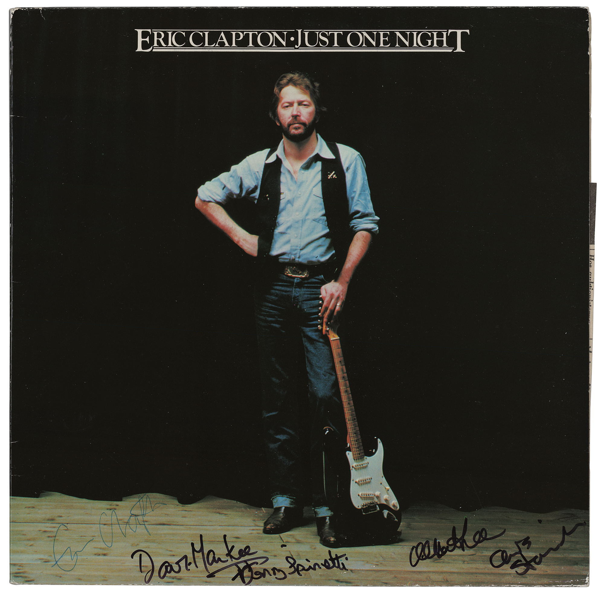 UK double vinyl pressing of the 1980 Eric Clapton album Just One Night, signed nicely on the lower front cover in blue ballpoint by Eric Clapton, and in black felt tip by Albert Lee, Dave Markee, Chris Stainton, and Henry Spinetti, the complete original lineup from the Just One Night album and subsequent world tour. In fine condition. The records are included. The autographs were obtained during the Just One Night Tour in Malmo, Sweden on October 13, 1981, prior to Clapton’s performance at Olympen in Lund, Sweden. The premiere instance in which we have offered the Just One Night album signed by the entire band.
