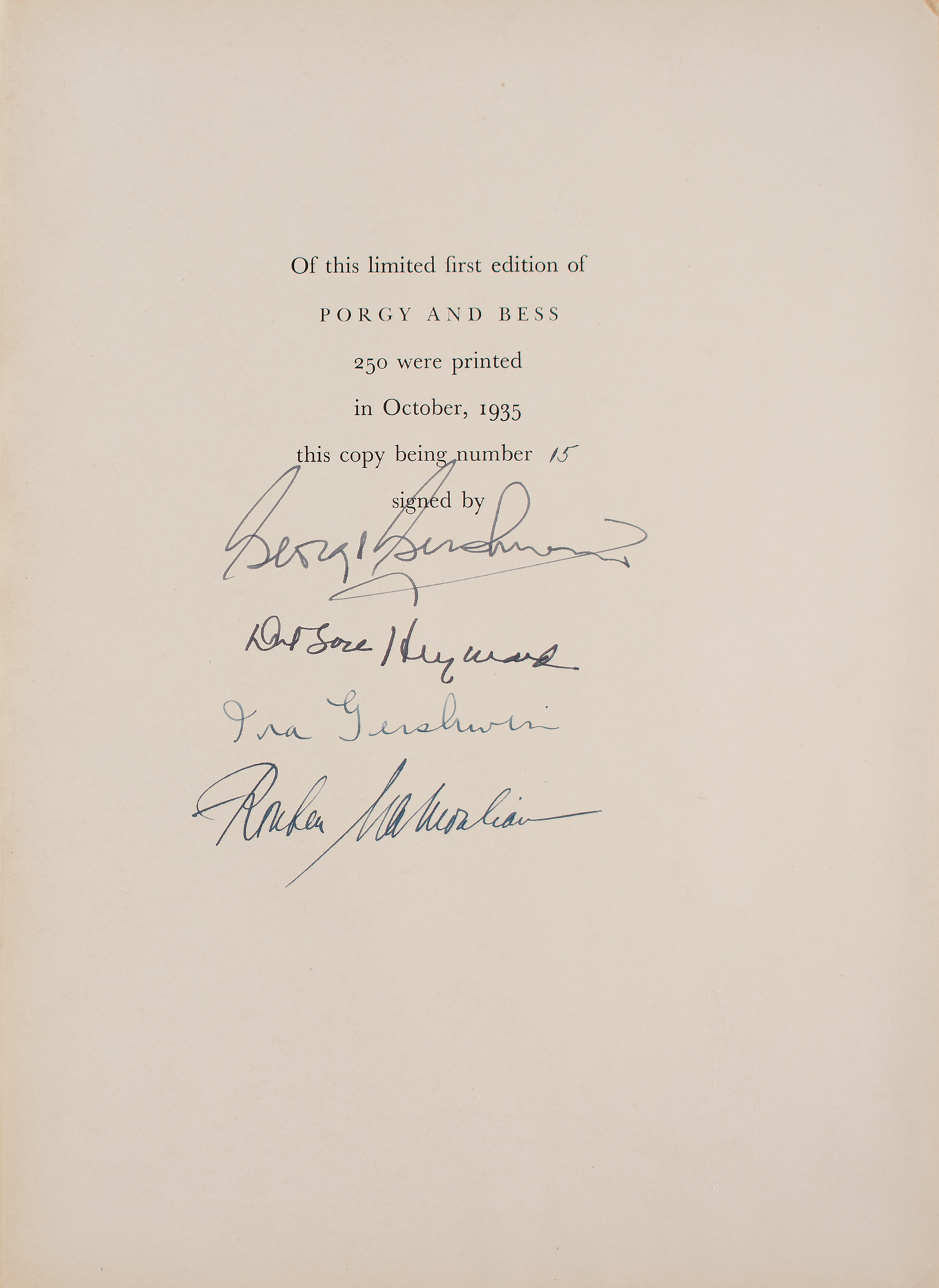 Signed book: Porgy and Bess. First edition, limited issue, numbered 15/250. NY: Random House, 1935. Hardcover bound in full red morocco, 9.75 x 12.5, 559 pages. Signed on the colophon in fountain pen by George Gershwin, Ira Gershwin, librettist Dubose Heyward, and director Rouben Mamoulian. Autographic condition: fine. Book condition: VG/None, with cracked hinges and light edgewear. Accompanied by a linen slipcase for Porgy and Bess, which, written as an 'American folk opera' according to George Gershwin, made its premiere on Broadway in the fall of 1935, and later toured several eastern cities. Although deemed a commercial failure during its initial run, it is now regarded as one of the most important American operas of the 20th century.