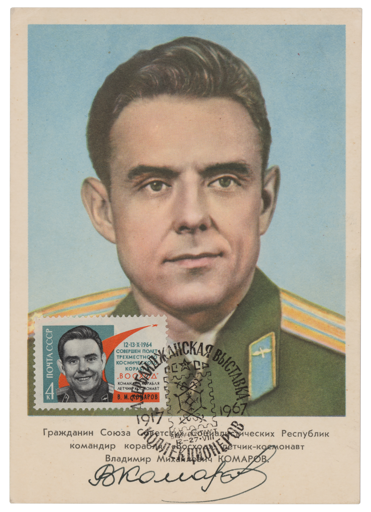 Soviet test pilot, aerospace engineer, and cosmonaut (1927-1964) who was the first human to die during a space mission. On his second flight, Soyuz 1, he was killed during the descent when the spacecraft crashed due to failure of the parachute. Color vintage 4 x 5.75 Soviet postcard photo of the ill-fated cosmonaut, signed in the lower border in fountain pen by Vladimir Komarov. A later postage stamp with cancelation has been affixed above the signature. In very fine condition.