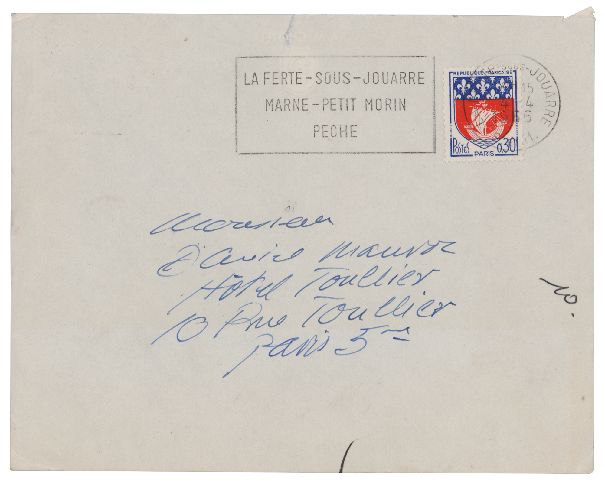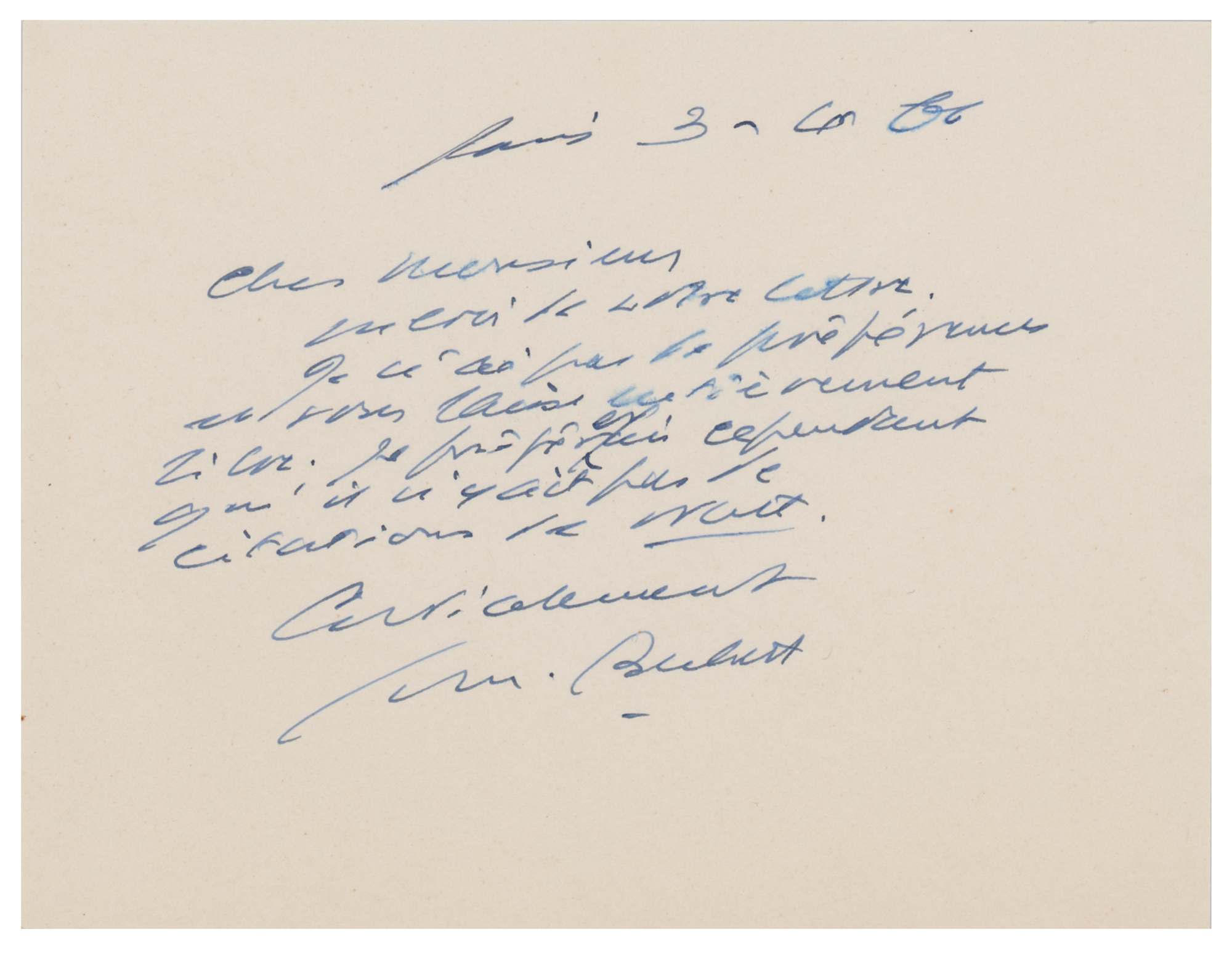ALS in French, one page, 5.5 x 4, 1966. Untranslated handwritten letter by Samuel Beckett. In fine condition. Accompanied by the original mailing envelope, addressed in Beckett's hand.