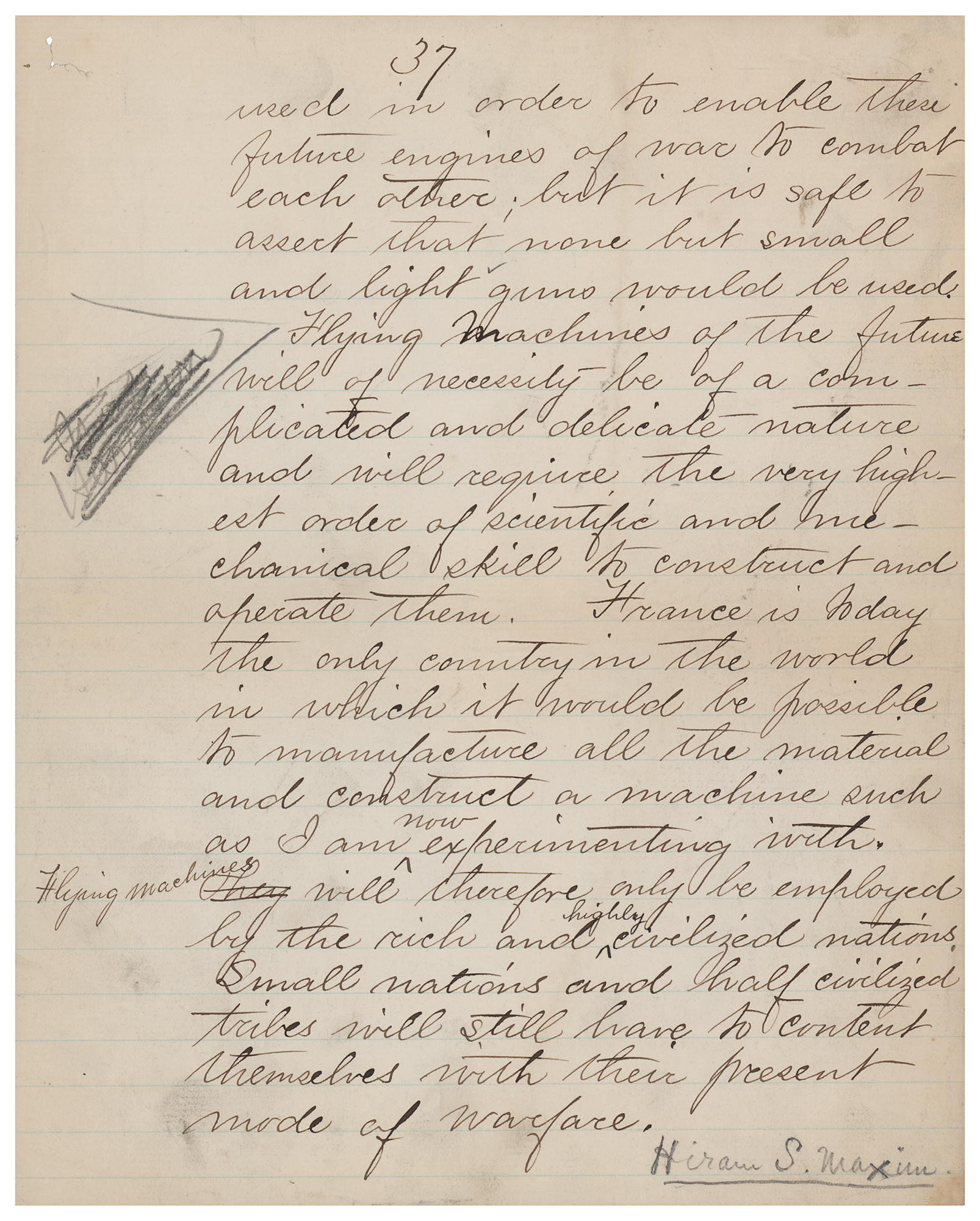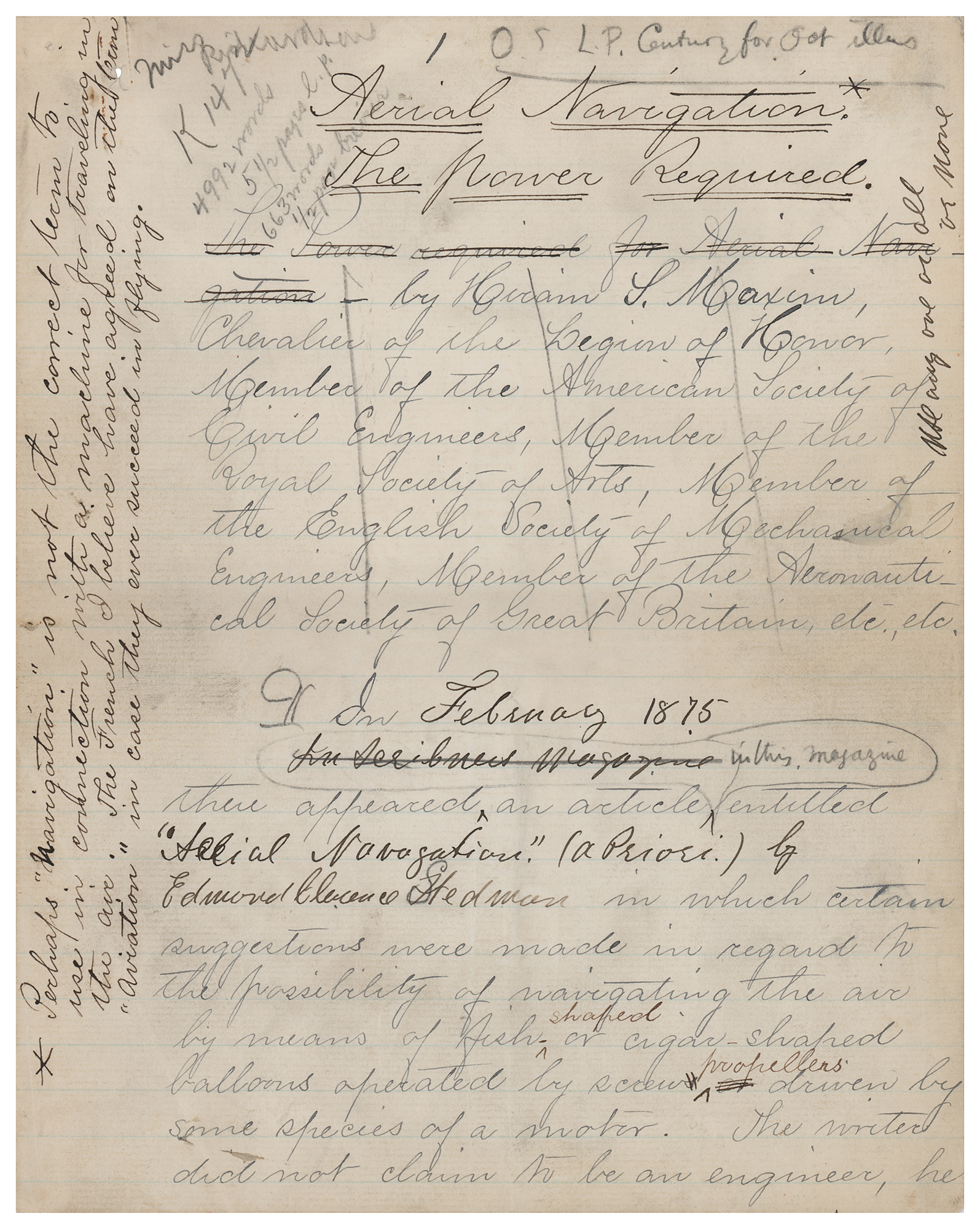 Inventor best known for the Maxim Gun, the first portable, fully automatic machine gun (1840-1916); he also made contributions to hair-curling irons, the mousetrap, and powered flight. Autograph manuscript signed by Hiram Maxim, 37 pages, 8 x 10, no date but circa 1891. A draft of Maxim's early aviation article entitled "Aerial Navigation: The Power Required," first published in The Century Magazine in October 1891. Maxim discusses the possibility of heavier-than-air flight, noting in the margin of the first page: "Perhaps 'Navigation' is not the correct term to use in connection with a machine for traveling in the air. The French I believe have agreed on the term 'Aviation' in case they ever succeed in flying." Following observations of birds and insects, Maxim determines the forces required for flight and propulsion. He observes: "The wings of a bird in flying perform a two fold function. They form primarily an aeroplane which supports the body after the manner of a kite, and secondarily a propellor for driving the aeroplane forward. I think all scientists are agreed that if we are ever able to navigate the air, it must be on the aeroplane system, that is, the weight of the machine and passenger or passengers must be carried by a large plane driven at a high velocity through the air." For propulsion, he discounts the "unscientific" idea of flapping wings, and favors "a screw propellor, because with it, it finds a high degree of efficiency and the possibility of applying a large amount of force in a continuous manner." In overall fine condition. A fascinating, early aviation manuscript that correctly anticipates the design of modern aircraft.