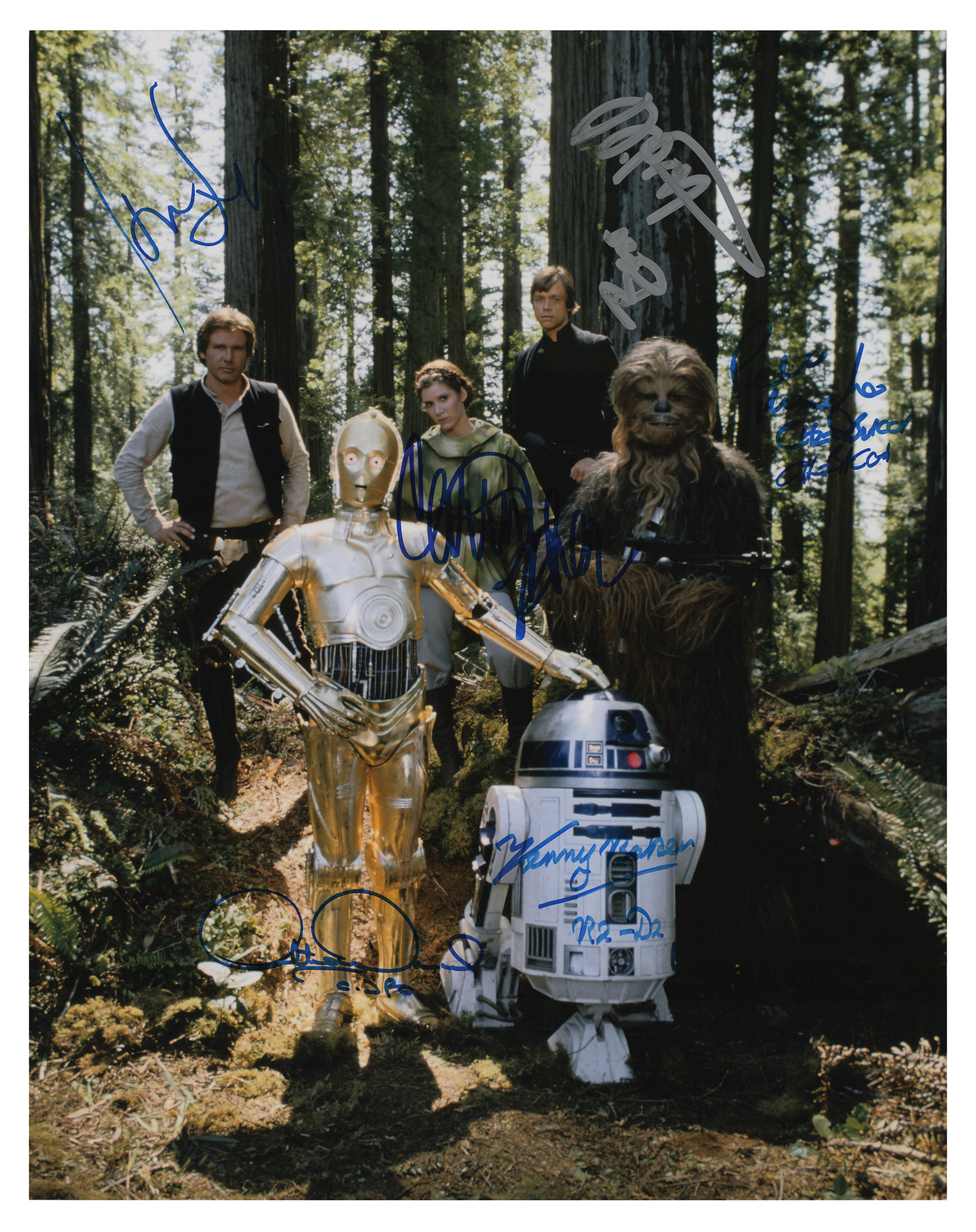 Color satin-finish 11 x 14 photo of the main cast from Return of the Jedi, signed in blue felt tip by Harrison Ford, Carrie Fisher, Anthony Daniels, who adds "C-3PO," Kenny Baker, who adds "R2-D2," and Peter Mayhew, who adds "Chewbacca," and in silver ink by Mark Hamill. In fine condition, with slight evidence of a possibly-removed Hamill inscription.