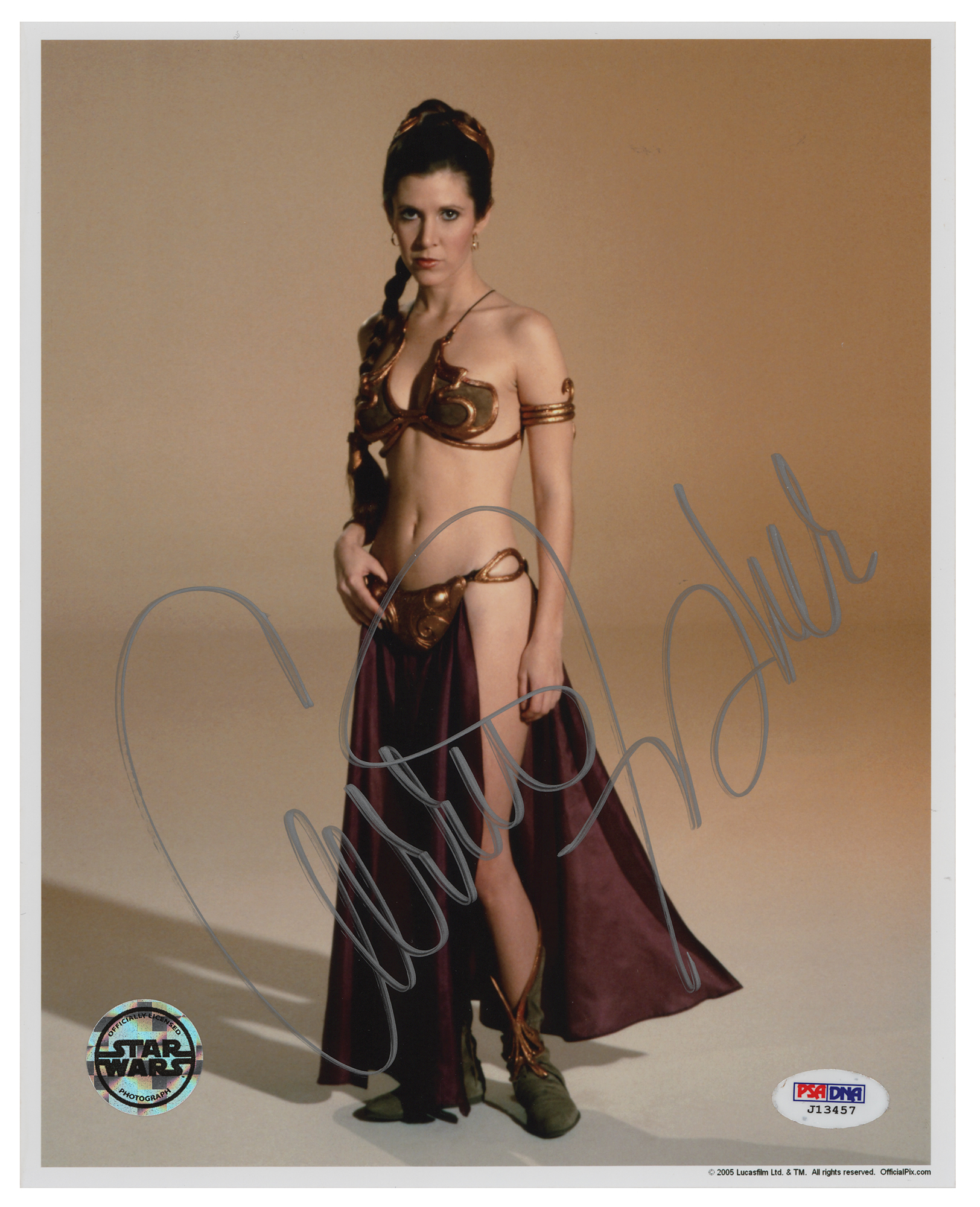Color satin-finish 8 x 10 Lucasfilm publicity photo of Carrie Fisher as Princess Leia Organa in her golden bikini from the 1983 film Return of the Jedi, signed in silver ink. In fine condition, with Official Star Wars and PSA/DNA labels affixed to the lower corners (certificates not present).
