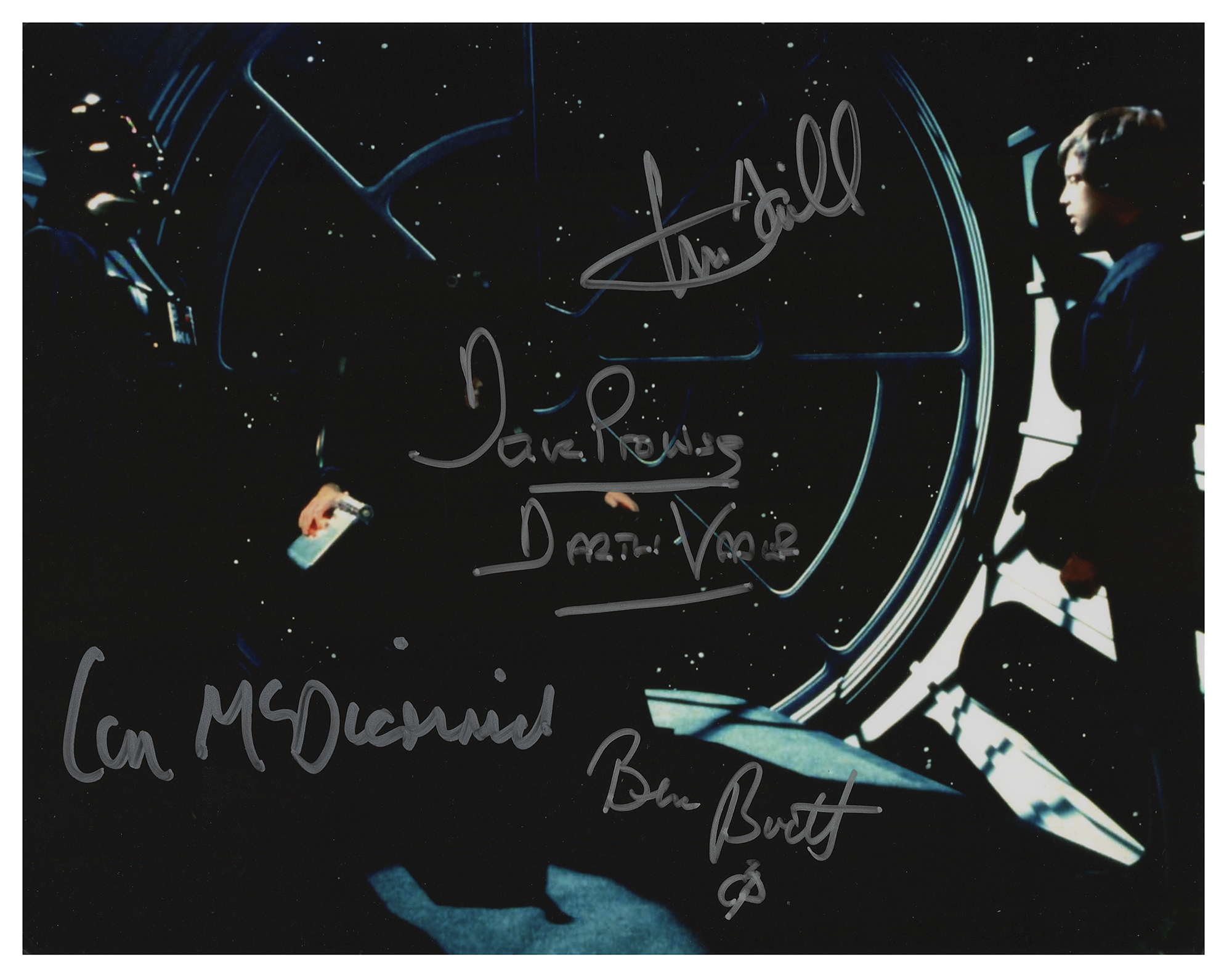 Color satin-finish 10 x 8 photo of Luke Skylwaker, Emperor Palpatine, and Darth Vader at the end of the 1983 sci-fi classic Return of the Jedi, signed in silver ink by Mark Hamill, Dave Prowse, who adds "Darth Vader," Ian McDiarmid, and Ben Burtt. In fine condition.