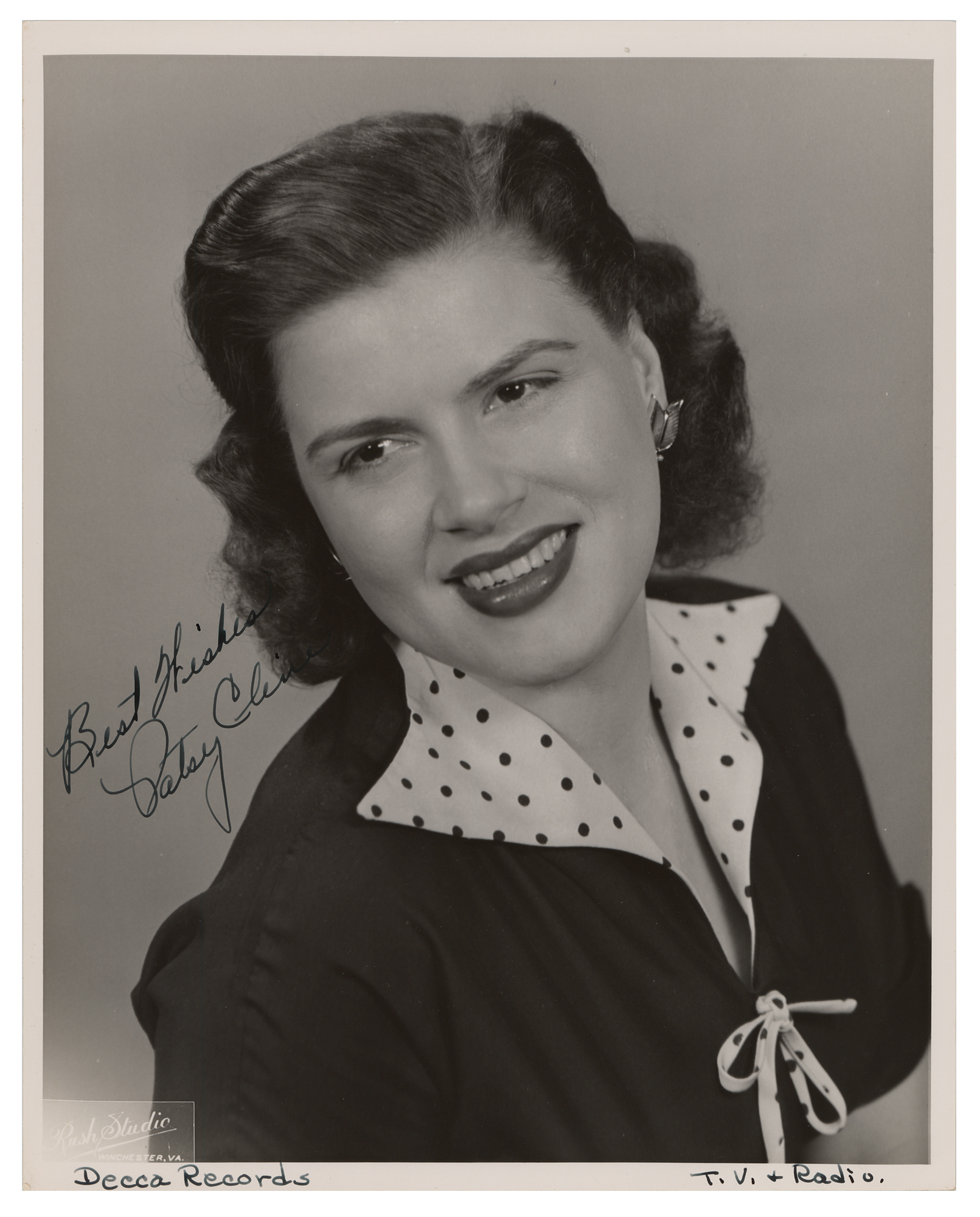 Vintage glossy 8 x 10 photo of Patsy Cline by Rush Studio of Winchester, Virginia, beautifully signed in fountain pen, "Best Wishes, Patsy Cline." In fine condition. A great portrait of the country-pop pioneer.