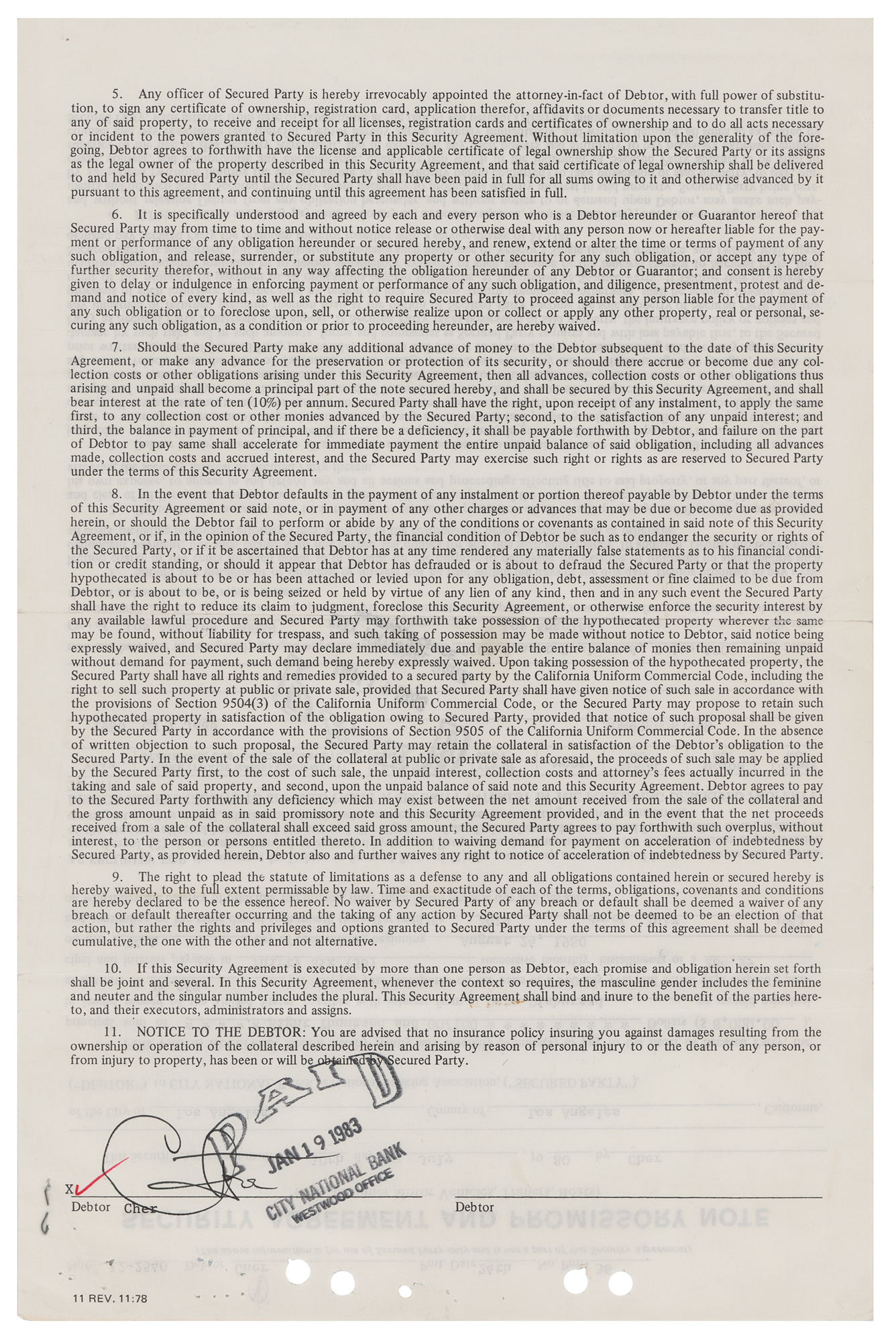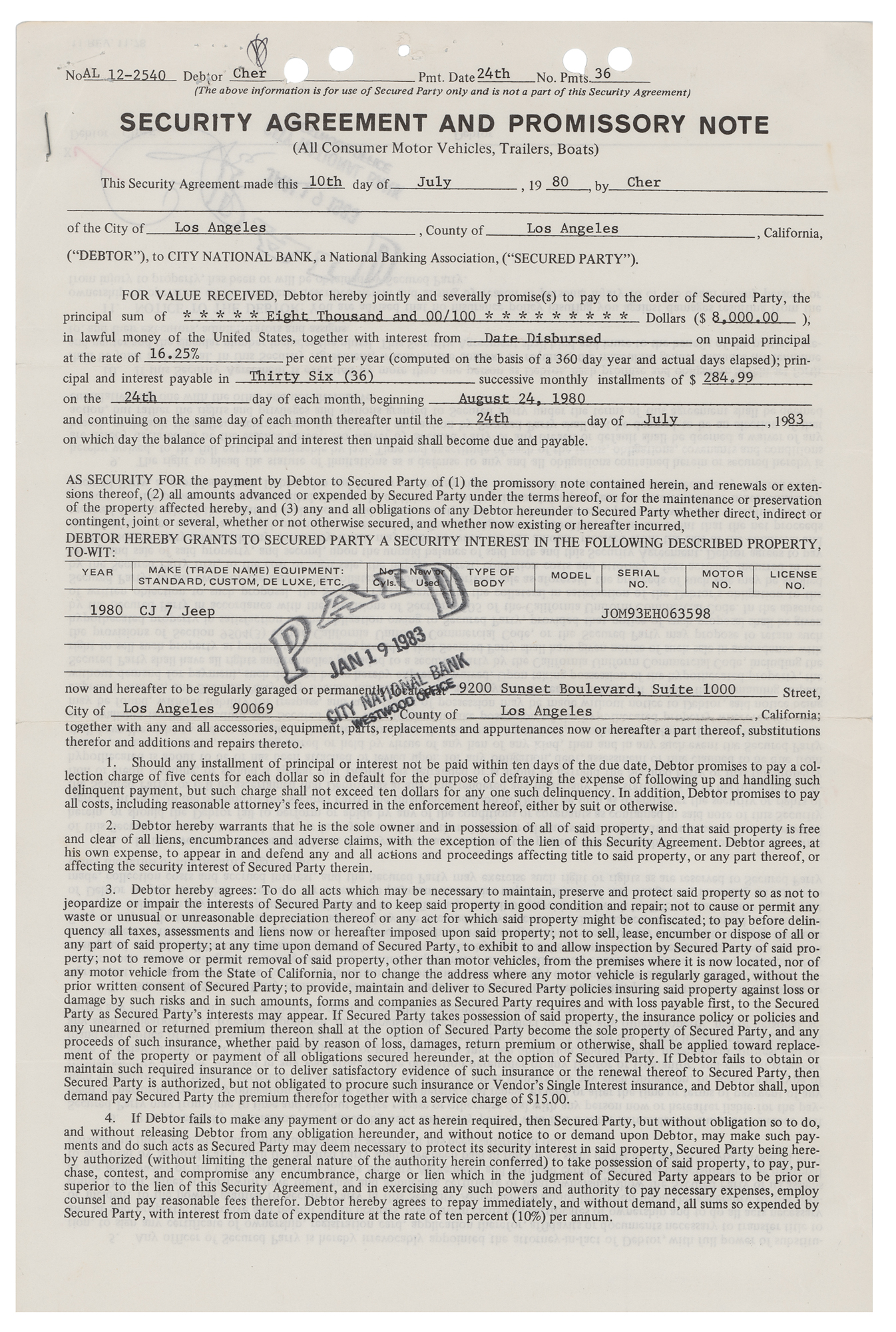 DS, one page both sides, 8.5 x 13, July 10, 1980. A security agreement and promissory note for the principal sum of $8,000 for a 1980 CJ 7 Jeep. Signed at the conclusion in black ink by Cher. The document was stamped 'Paid' on January 19, 1983. In fine condition.
