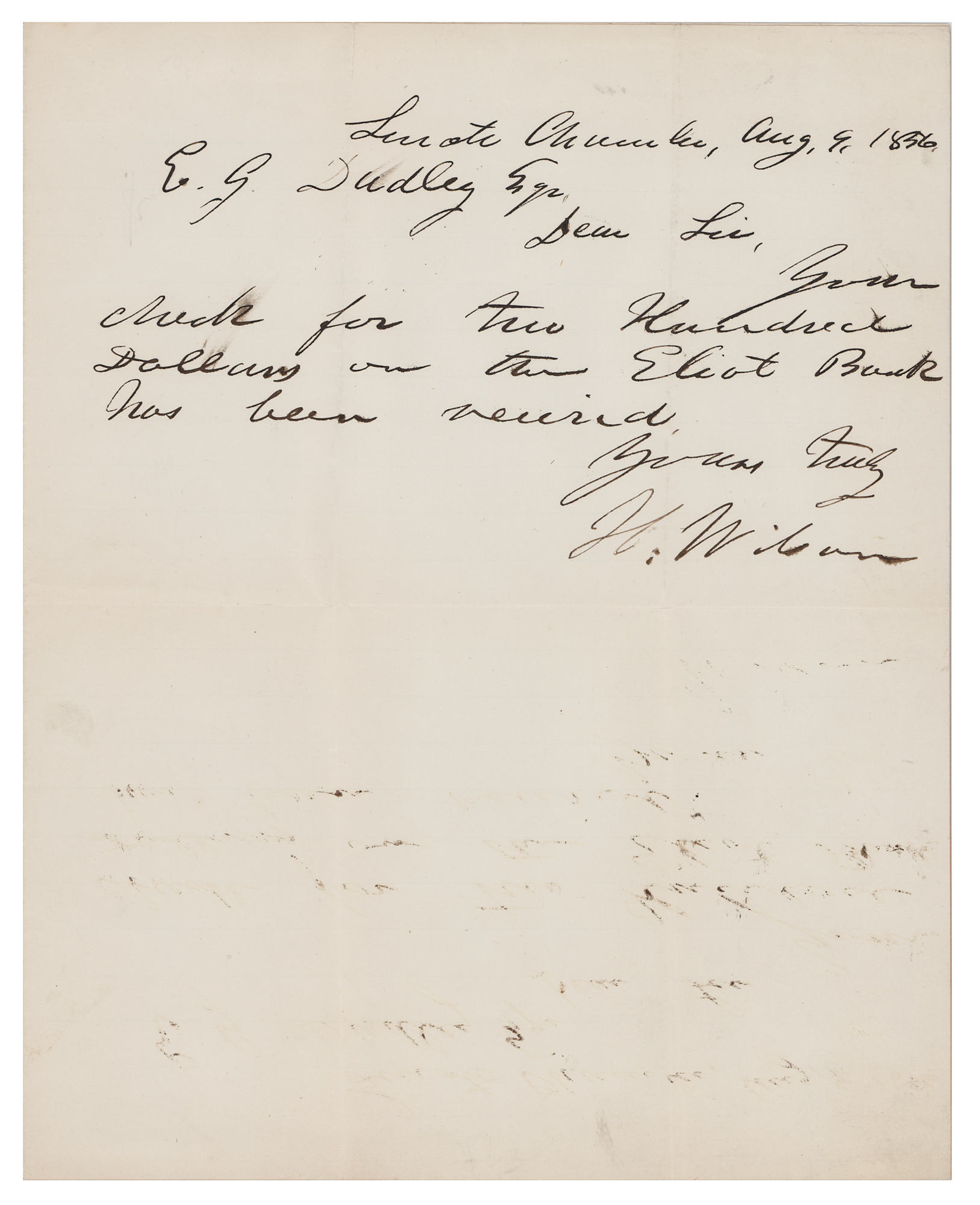 U. S. Grant's vice president (1812-1875) who died during his term in office. ALS signed “H. Wilson,” one page, 7.75 x 9.5, August 9, 1856. Handwritten letter from the "Senate Chambers," addressed to E. G. Dudley, in full: "Your check for two Hundred Dollars on the Eliot Bank has been received." In very good to fine condition, with some creasing to the top edge, and ink offset at the bottom from premature folding.