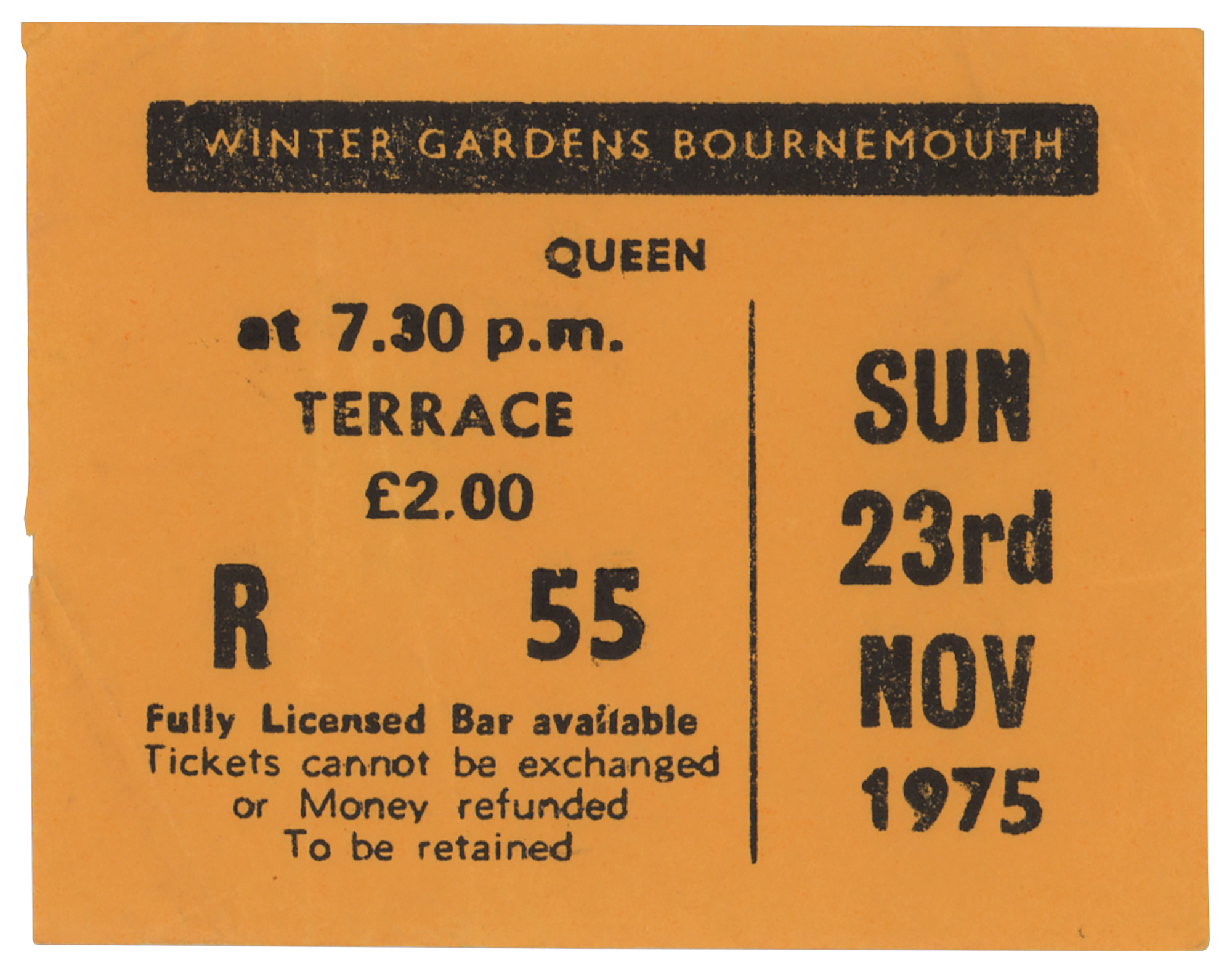 Accompanied by a certificate of authenticity from Tracks, a concert ticket from the Winter Gardens performance, and a letter of provenance from the original recipient, which reads: “On the morning of Sunday 23rd November 1975, myself and a friend went down to the Winter Gardens Bournemouth to watch the road crew load in for the Queen show that night, something we often did, and maybe hang outside to hear the sound check. We asked the crew if they knew where the band were staying, and after being told some wrong places, eventually found them at the Road House hotel in the Lansdowne about half a mile up the road. We saw them through a window eating Sunday lunch, and waited till they finished, eventually coming out one by one, rather than together, which is how we both got our autograph books signed. Freddie was wearing his white satin suit too! Roger chatted a bit, and drew a logo. That was it really, and that night we went to the gig (it was the Night At The Opera tour), the ticket of which I enclose here.”