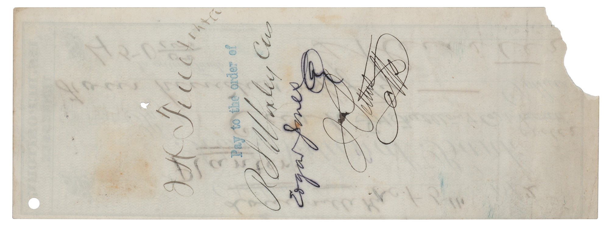 Planters National Bank of Louisville counter check, 8 x 3, filled out and signed by Custer, "G. A. Custer," payable to cash for $450, October 3, 1872. The printed text of the check has been modified in another hand, changing the bank name to "Planters" and place to "Louisville," and adding "J. H. Fullerton & Co., order," to the recipient field. In very good to fine condition, with scattered light staining, a couple of small holes, and paper loss to the lower right corner (close to, but not impinging on, the signature).