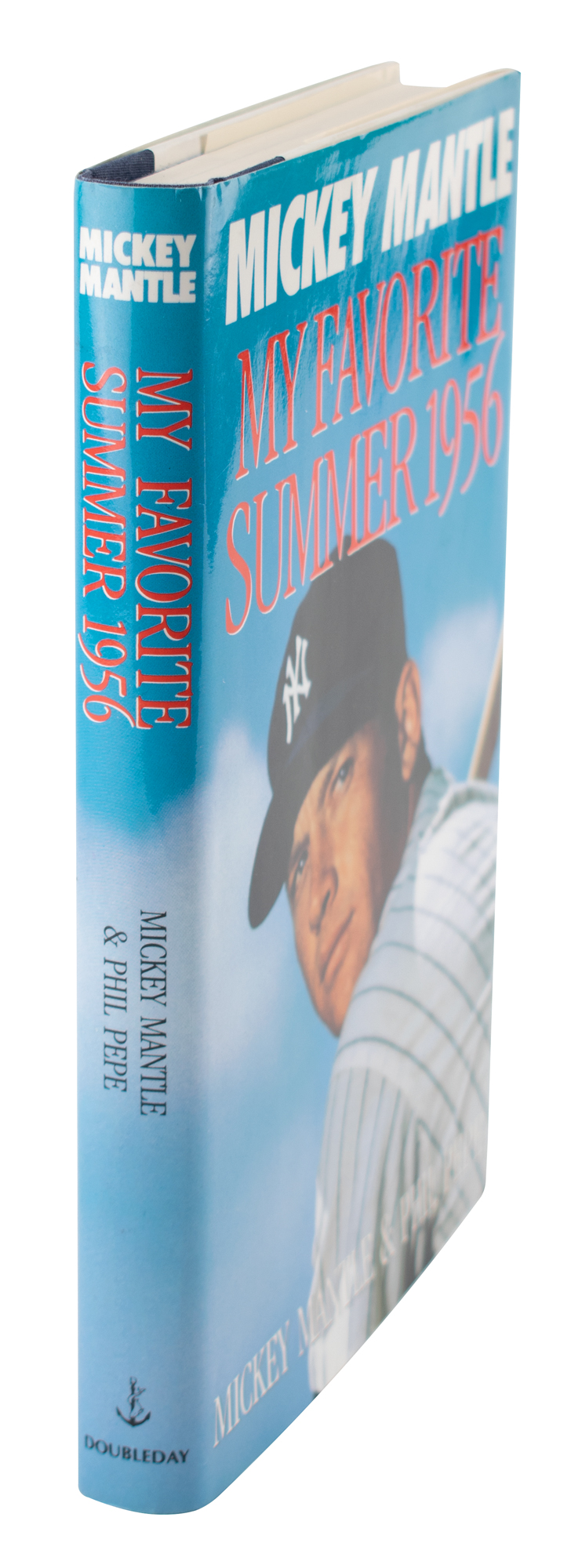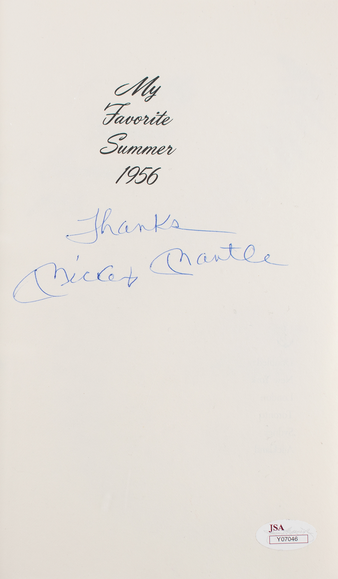 Signed book: My Favorite Summer 1956. First edition. NY: Doubleday, 1991. Hardcover with dust jacket, 6.5 x 9.5, 246 pages. Signed on the half-title page in blue ballpoint, "Thanks, Mickey Mantle." In fine condition, with a JSA label affixed to the signed page. Accompanied by a full letter of authenticity from JSA.