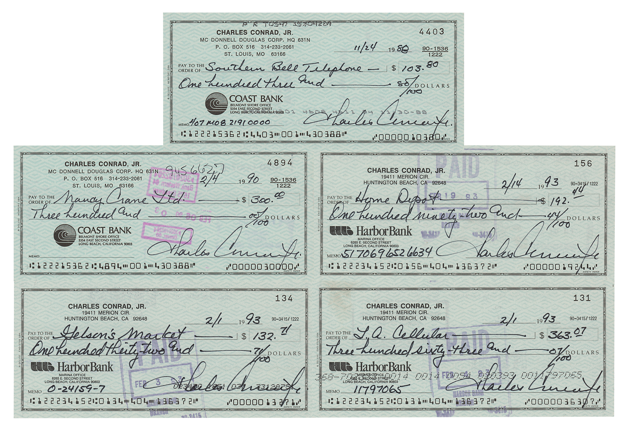 Group of five personal checks filled out and signed by Conrad, "Charles Conrad, Jr.," 6 x 2.75, dated from 1988 to 1993. Payees include Southern Bell, Home Depot, L.A. Cellular, Nancy Crane, and Gelson's Market. In overall fine condition.