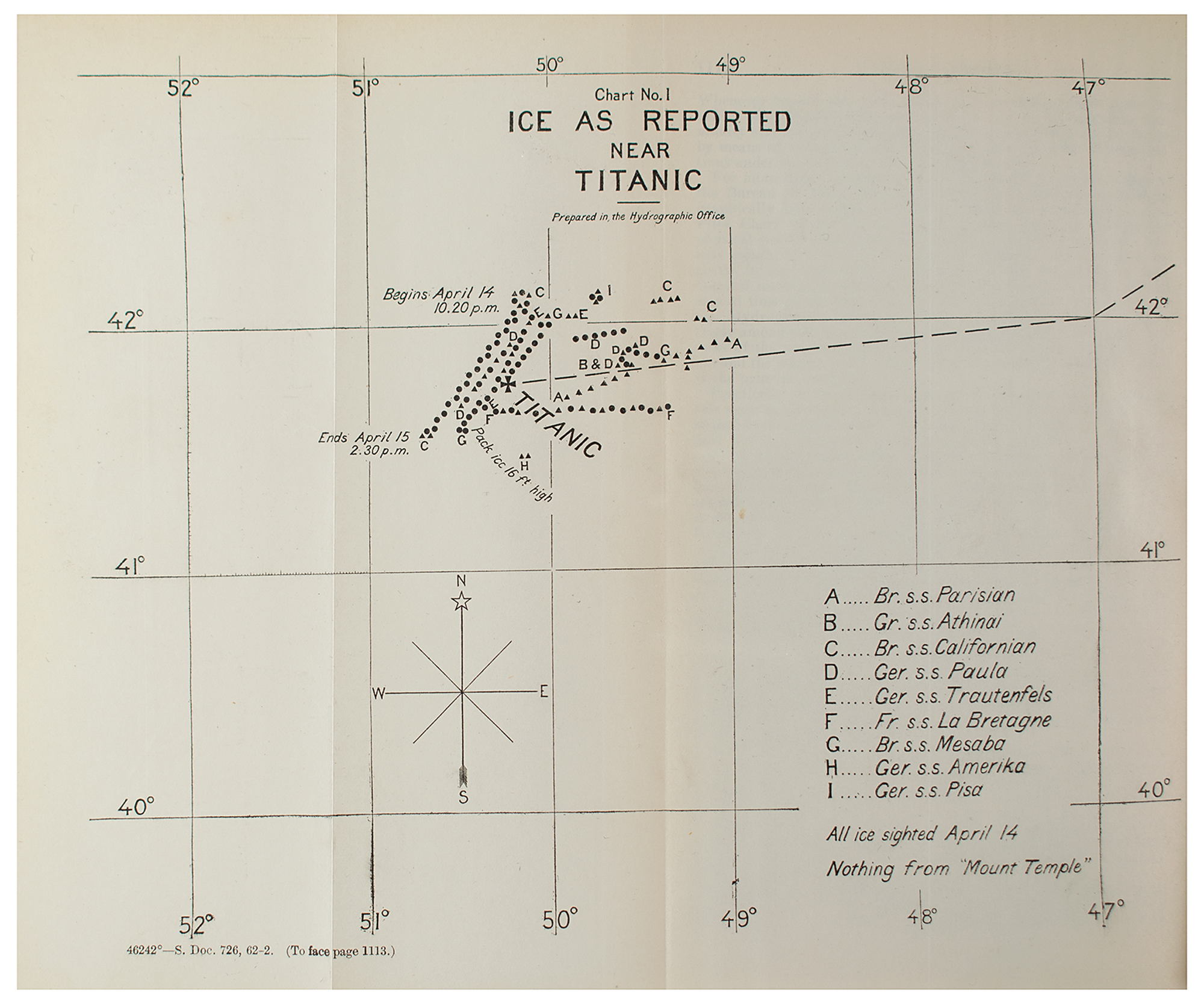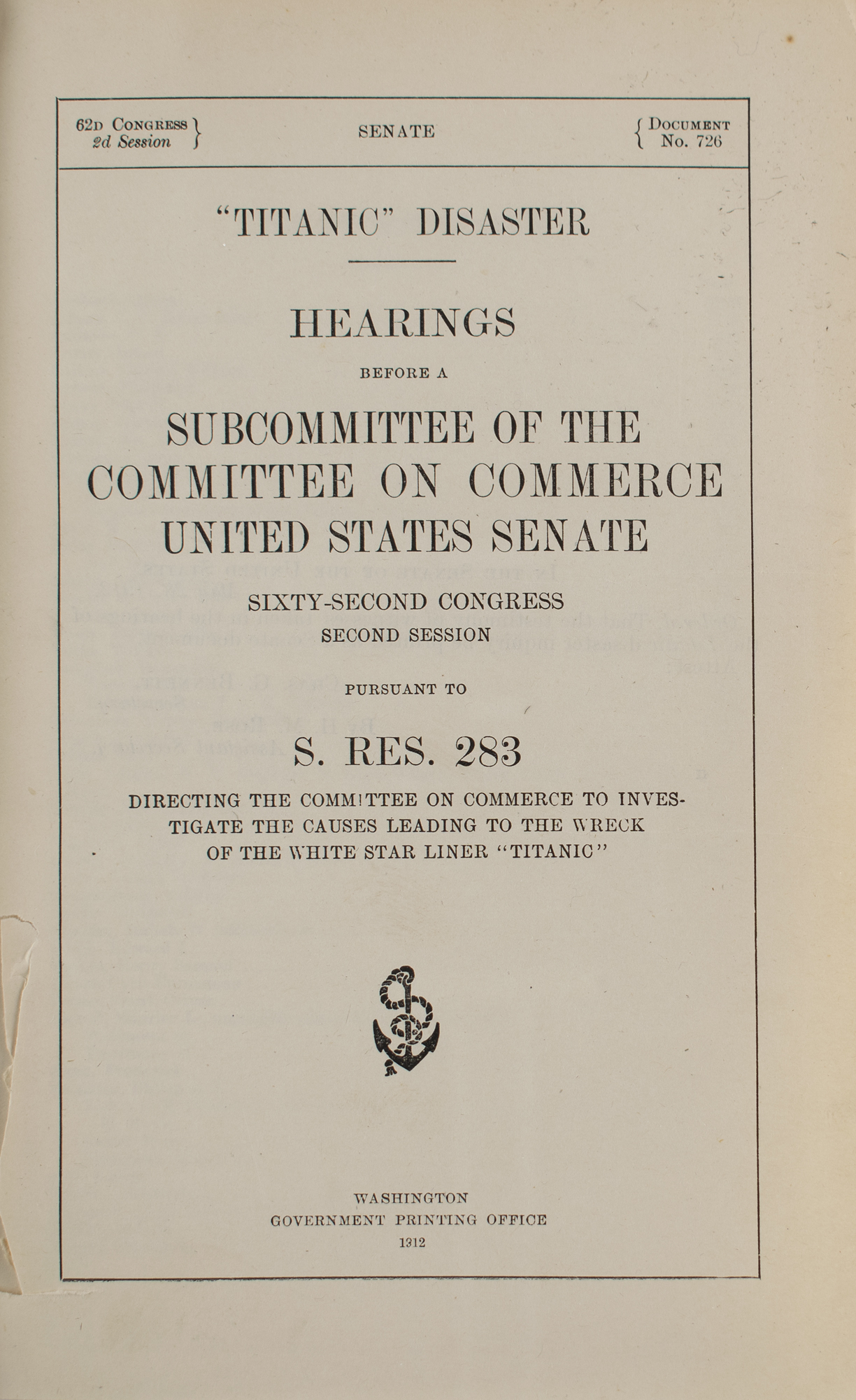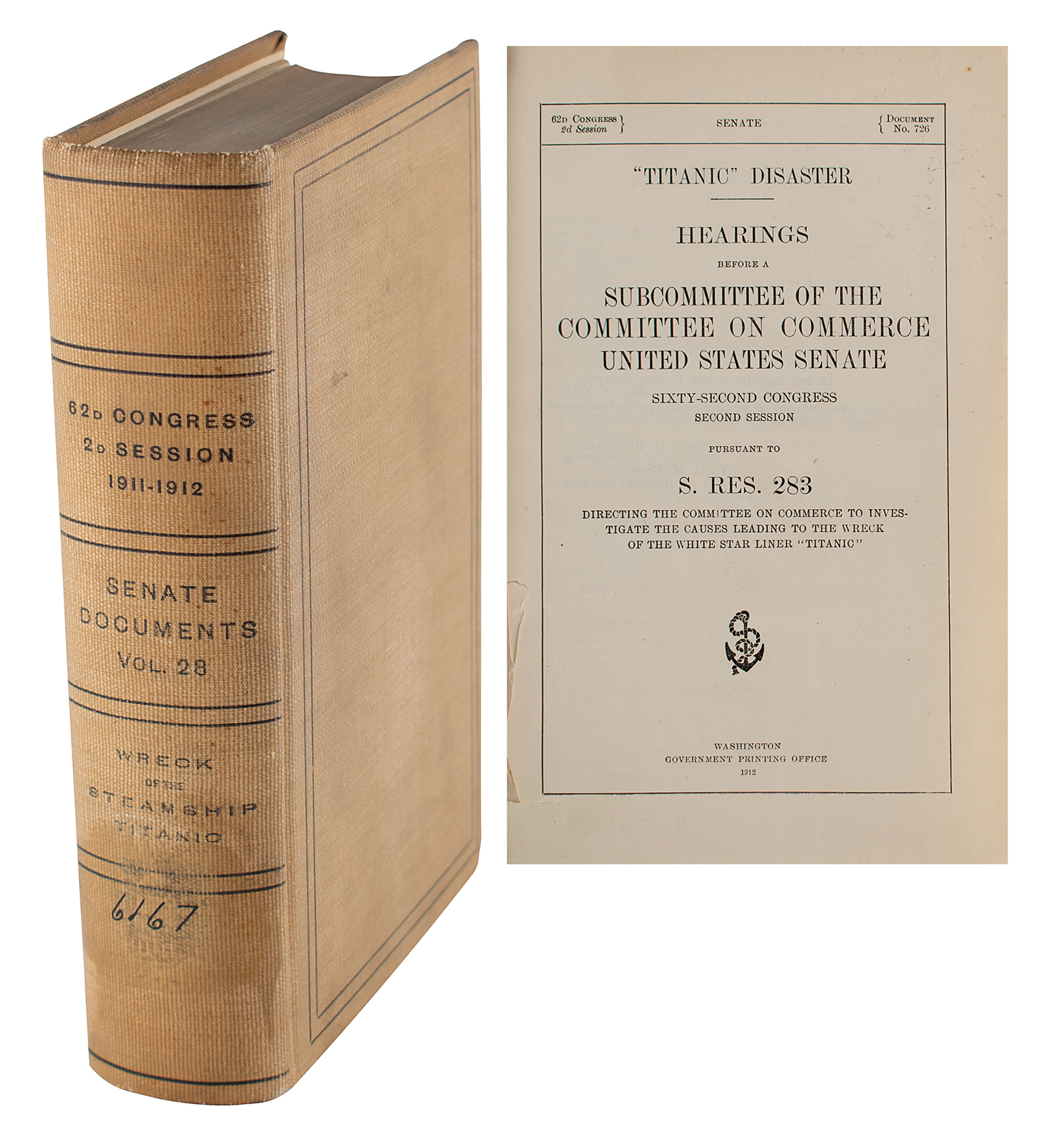 Uncommon book: 'Titanic' Disaster: Hearings before a Subcommittee of the Committee on Commerce, United States Senate…Pursuant to S. Res. 283, Directing the Committee on Commerce to Investigate the Causes Leading to the Wreck of the White Star Liner 'Titanic.' Washington, DC: Government Printing Office, 1912. Hardcover, 6.5 x 9.25, 1163 pages. The comprehensive volume documents the testimony of numerous witnesses, describing the alarm, effect of the collision, distinction between classes of passengers, knowledge of icebergs, the ship sinking, and rescue boats. Complete with its two fold-out charts, entitled "Ice as Reported Near Titanic" and "Ice Barrier—Nearby Ships." In very good condition, with cracked hinges, shellacked library markings to spine, and some losses to the gutter of the title page.