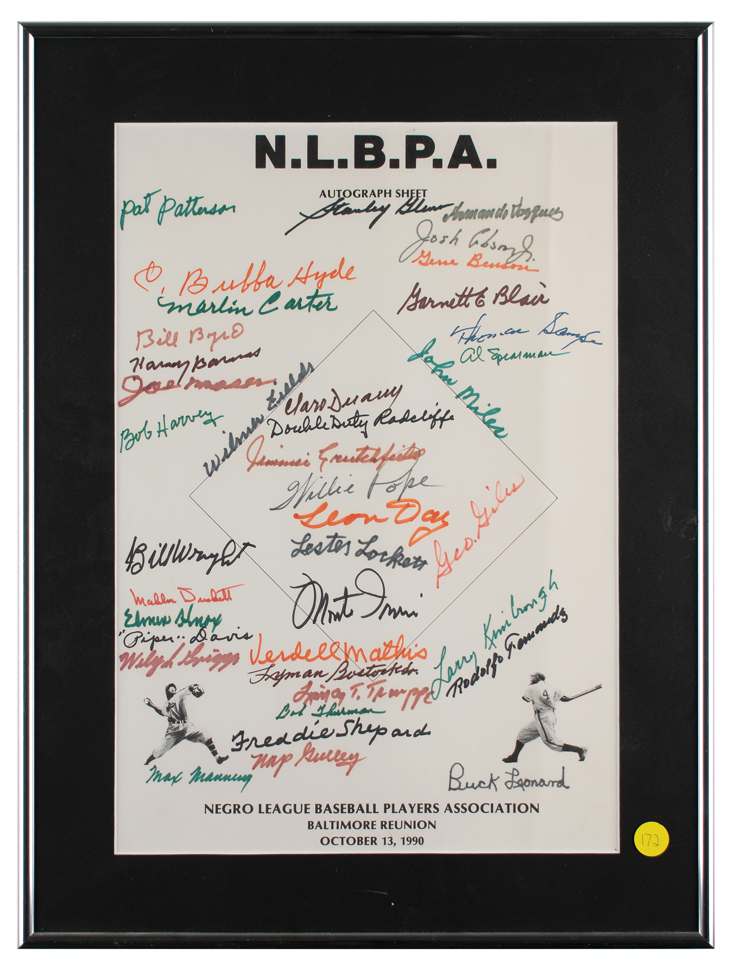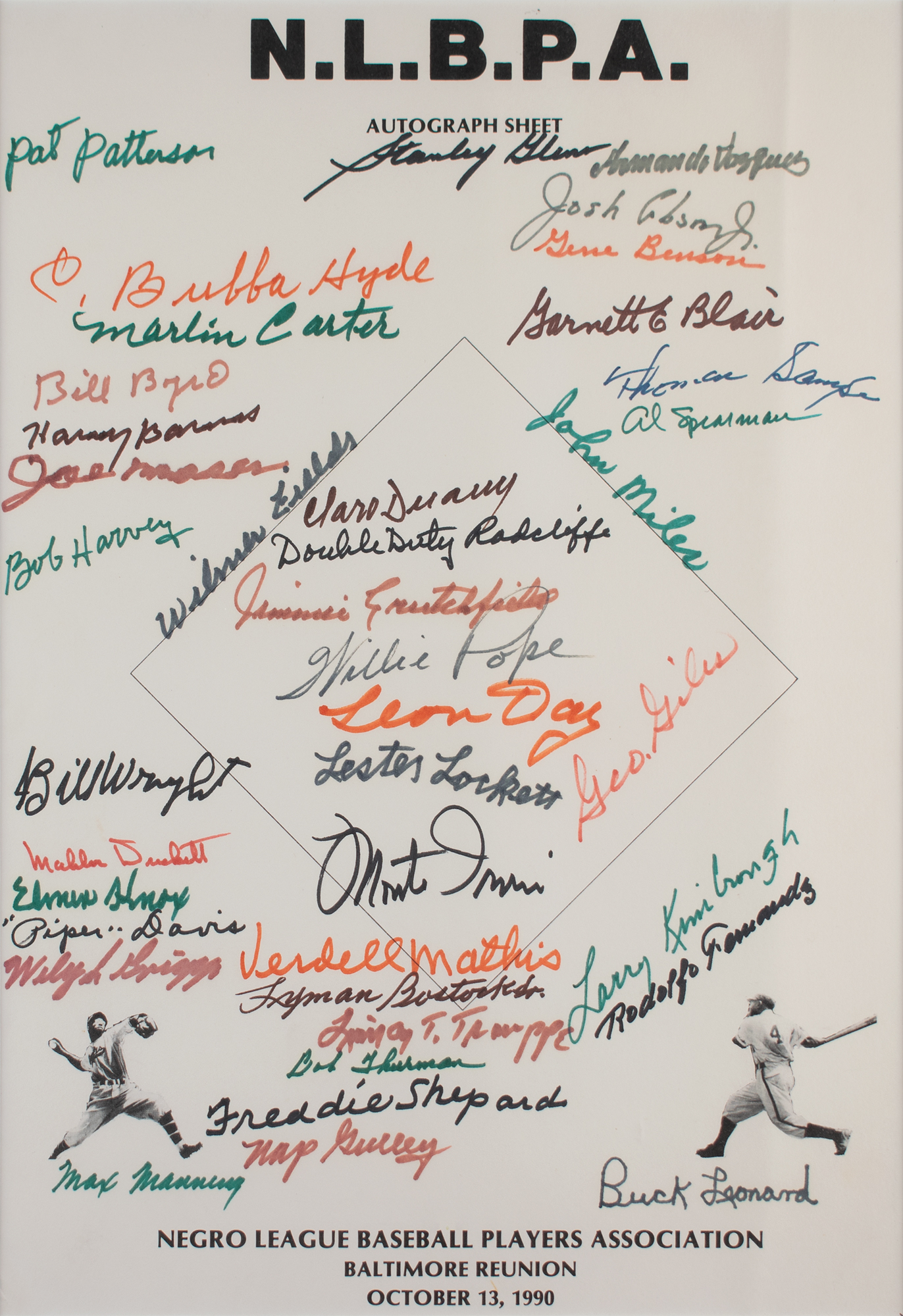 Negro League Baseball Players Association 11 x 17 autograph sheet signed in black and colored felt tip by forty players, including Monte Irvin, Lester Lockett, Double Duty Radcliffe, Buck Leonard, Pat Patterson, C. Bubba Hyde, Bob Harvey, Piper Davis, Max Manning, Verdell Mathis, Bob Thurman, Freddie Shepard, Nap Gulley, Larry Kimbrough, John Miles, Garnett E. Blair, Gene Benson, Al Spearman, Geo[rge] Giles, Leon Day, Willie Pope, and nineteen others. Matted and framed to an overall size of 15.25 x 20.25. In very good to fine condition, with a crease to the lower right corner, and full-length vertical bend to the right side.