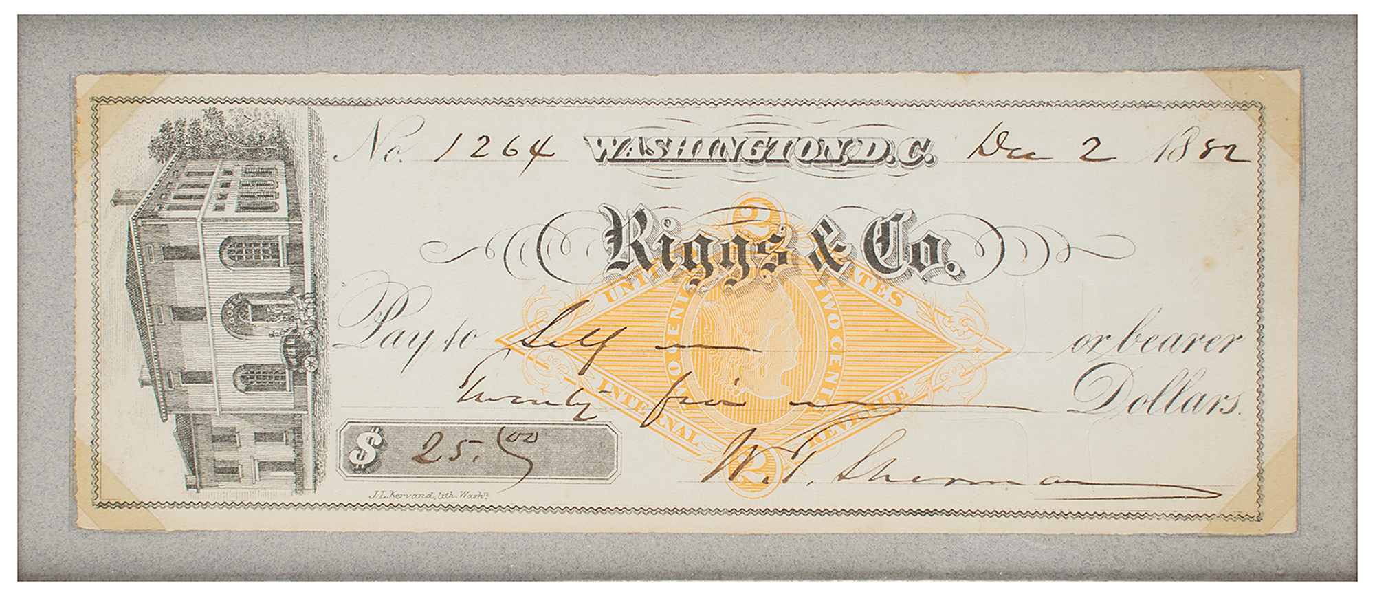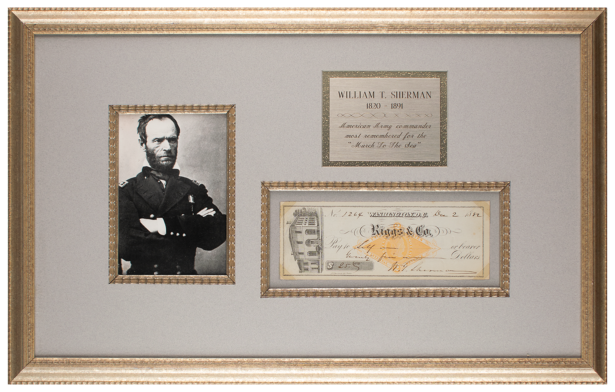 Riggs & Co. bank check, 7.5 x 2.75, filled out and signed by Sherman, payable to self for $25, December 2, 1882. Corner-mounted, matted, and framed with a portrait and plaque to an overall size of 21.75 x 13.75. In fine condition.
