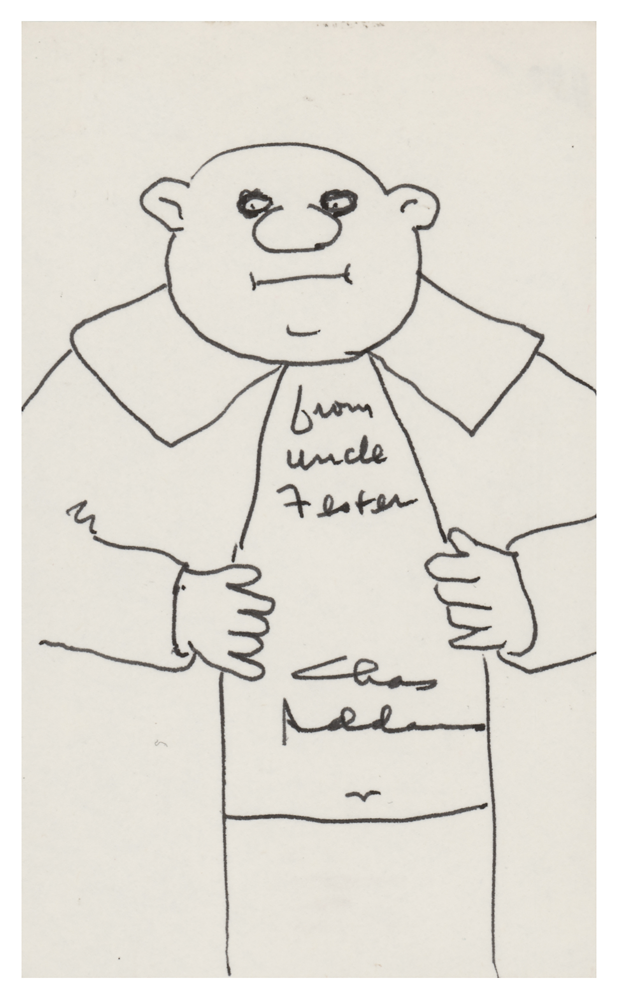 Fantastic original ink sketch of Uncle Fester from the Addams Family on a white 3 x 5 card, neatly signed, "From Uncle Fester, Chas Addams." In very fine condition. A great drawing by the famed cartoonist.