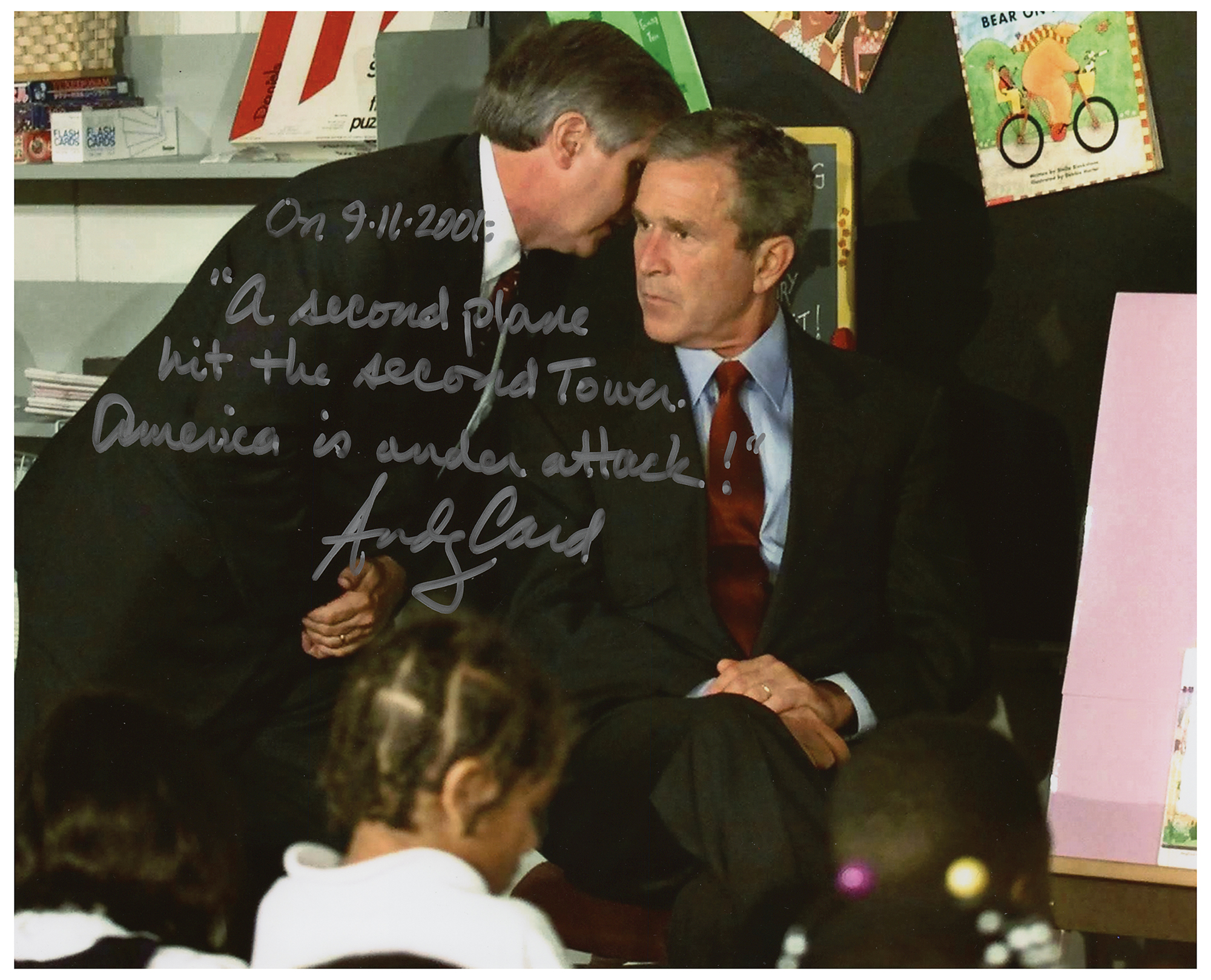 Color glossy 10 x 8 of Card informing President Bush of the terrorist attacks on the World Trade Center, signed in silver ink, "On 9-11-2001: 'A second plane hit the second Tower. America is under attack!' Andy Card." In very fine condition.
