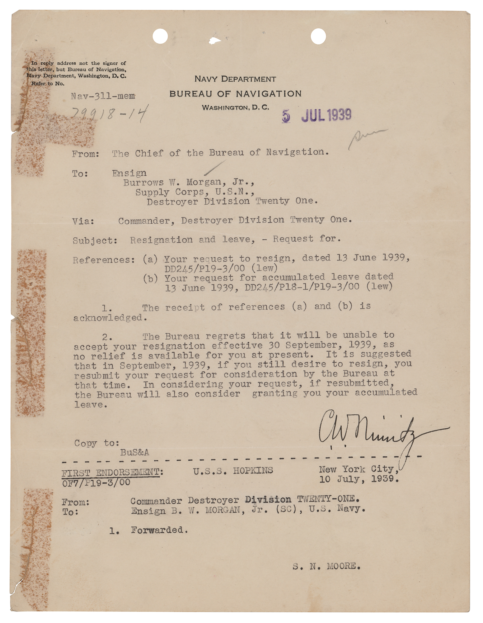 TLS signed “C. W. Nimitz,” one page, 8 x 10.5, Bureau of Navigation letterhead, July 5, 1939. Letter to Ensign Burrows W. Morgan, Jr., of the Navy's Supply Corps, denying a request for resignation. In part: "The Bureau regrets that it will be unable to accept your resignation effective 30 September, 1939, as no relief is available for you at present. It is suggested that in September, 1939, if you still desire to resign, you resubmit your request for consideration by the Bureau at that time." In very good to fine condition, with stains along the left edge from old tape on the back.