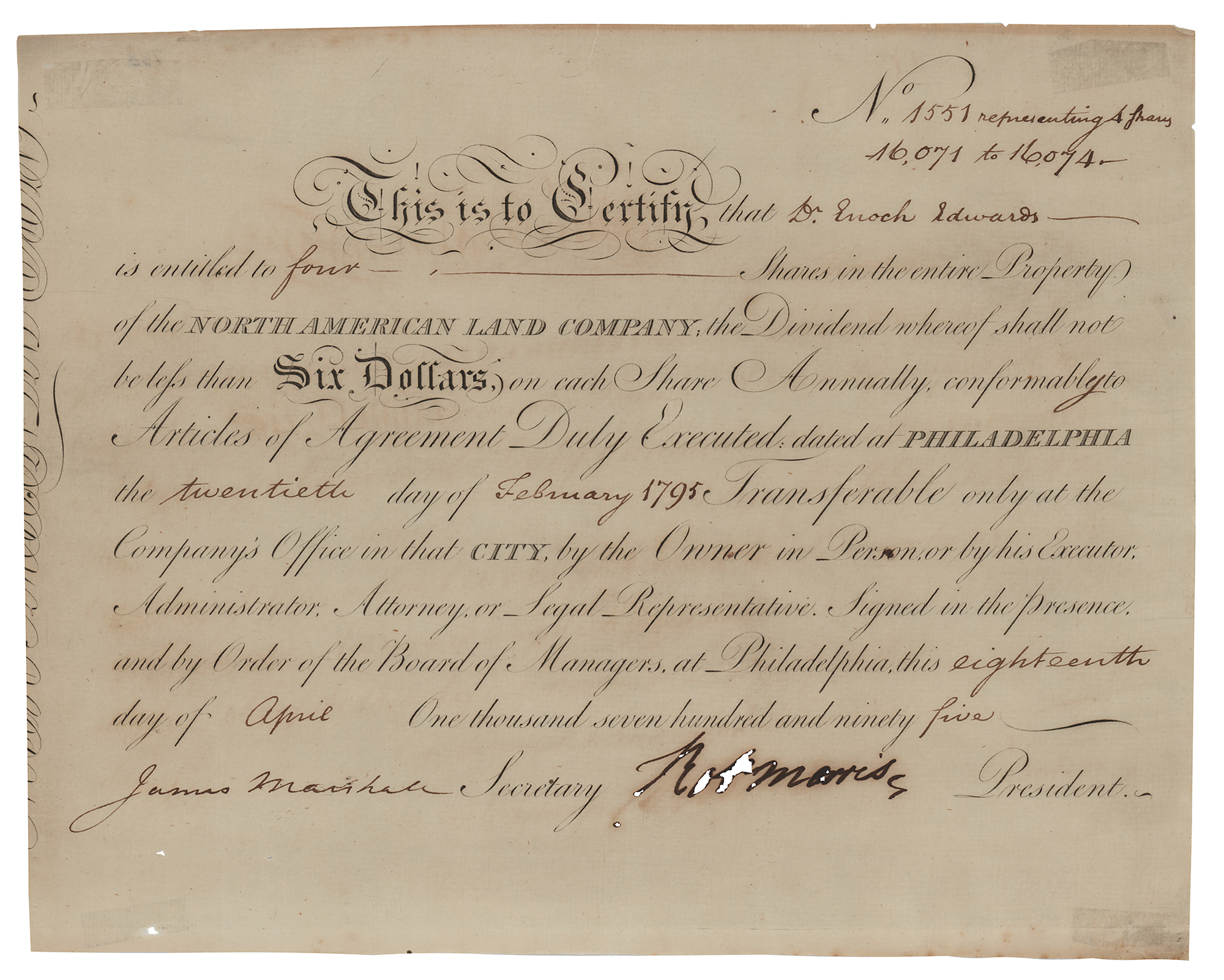 Important financier who signed the Declaration of Independence, Articles of Confederation, and Constitution (1734-1806). Partly-printed DS, signed “Rob't Morris,” one page, 11.75 x 9.5, April 18, 1795. Document certifying that "Dr. Enoch Edwards is entitled to four Shares in the entire Property of the North American Land Company, the Dividend whereof shall not be less than Six Dollars on each Share Annually." Signed at the conclusion by Morris as the company's president and countersigned by James Marshall as secretary. In very good to fine condition, with stains at the corners from old tape on the back, and ink erosion to the signature.