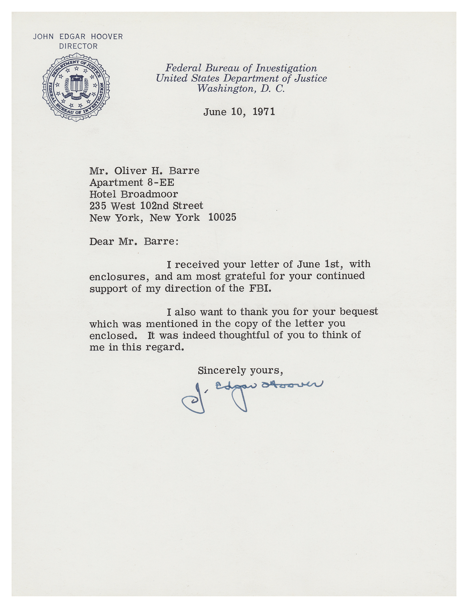 TLS, one page, 7.25 x 9.5, Federal Bureau of Investigation letterhead, June 10, 1971. Letter to Oliver H. Barre, in full: "I received your letter of June 1st, with enclosures, and am most grateful for your continued support of my direction of the FBI. I also want to thank you for your bequest which was mentioned in the copy of the letter you enclosed. It was indeed thoughtful of you to think of me in this regard." In fine condition.