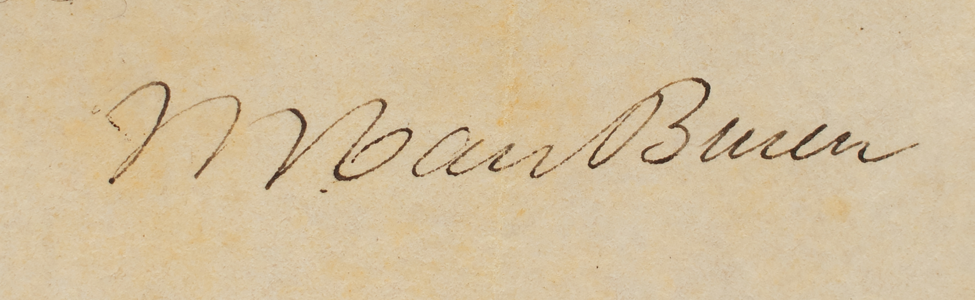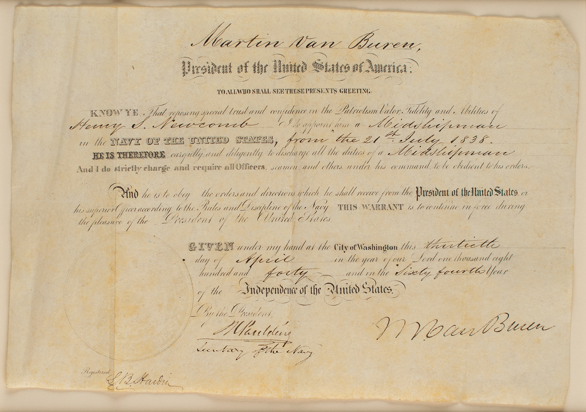 Partly-printed DS, signed “M. Van Buren,” one page, 10 x 7, April 30, 1864. President Van Buren appoints Henry S. Newcomb as "a Midshipman in the Navy of the United States." Signed at the conclusion by President Van Buren and countersigned by Secretary of the Navy James K. Paulding. Mounted, matted, and framed to an overall size of 17 x 14. In fine condition, with some light creasing to the left edge.
