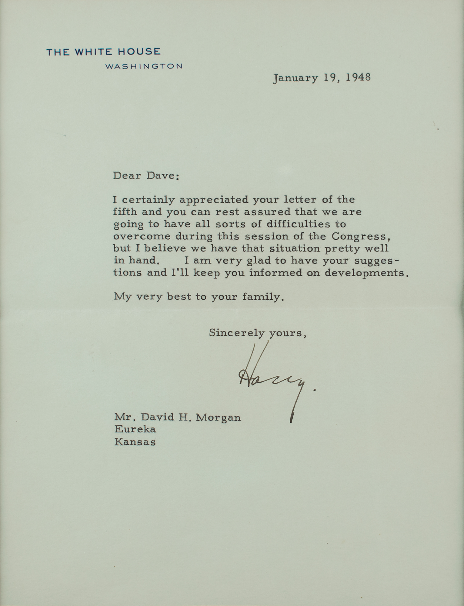 TLS as president signed “Harry,” one page, 6.5 x 8.5, White House letterhead, January 19, 1948. Letter to David H. Morgan, in part: "I certainly appreciated your letter of the fifth and you can rest assured that we are going to have all sorts of difficulties to overcome during this session of the Congress, but I believe we have that situation pretty well in hand." Nicely double-matted and framed with a portrait to an overall size of 17.5 x 14.25; the original mailing envelope is displayed in a window on the reverse. In fine condition.