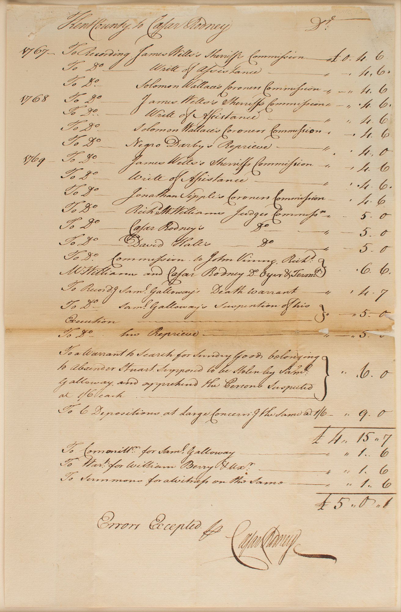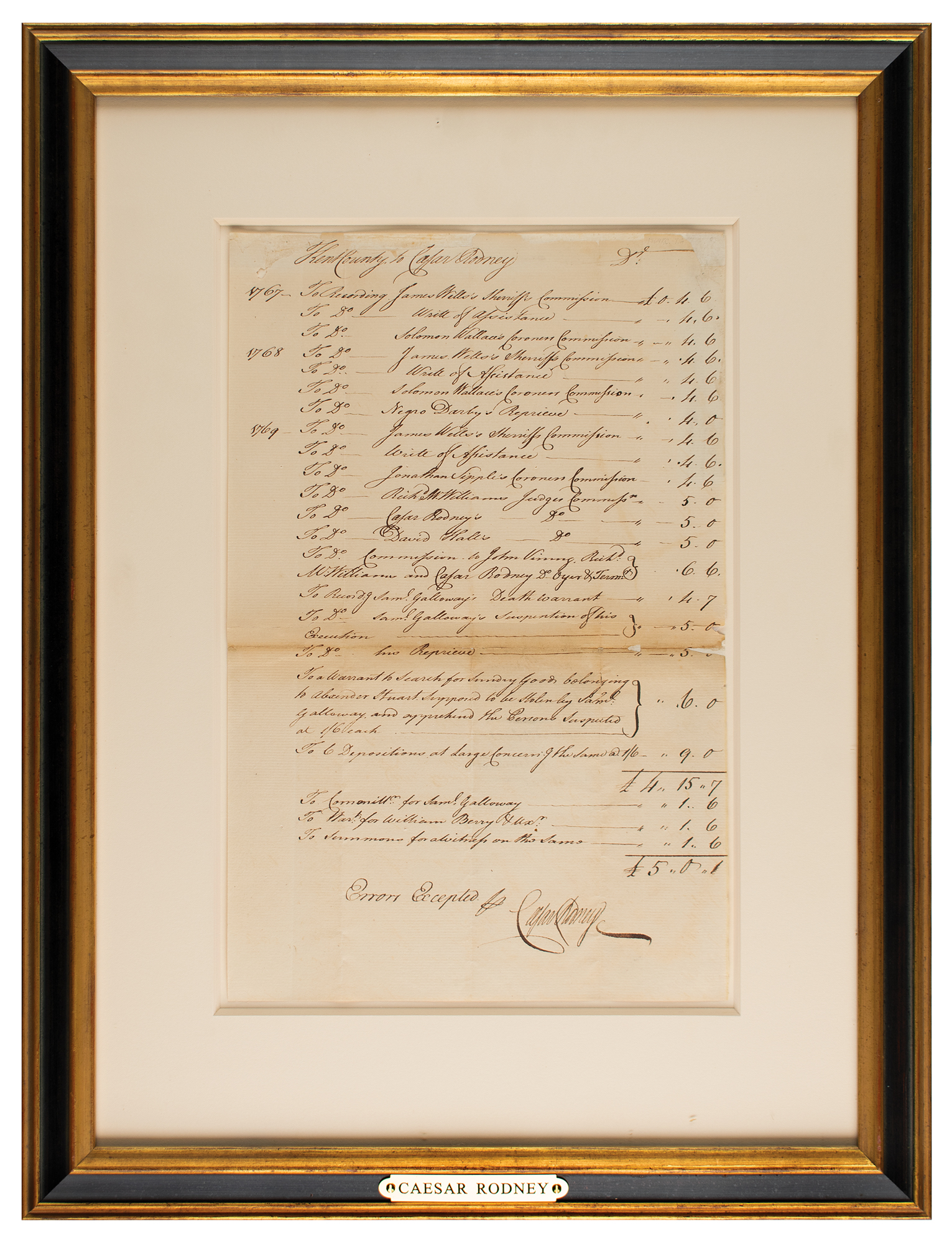 Signer of the Declaration of Independence from Delaware (1728-1784) who famously rode his horse 80 miles non-stop to break the deadlock within the Delaware delegation to vote in favor of independence on July 2, 1776. Manuscript DS, one page, 8 x 12.25, circa 1769. Accounting document for expenses paid to Rodney by Kent County, Delaware, listing fees for recording the commissions of various judges, sheriffs, and coroners, the execution of warrants, and other legal matters. Nicely signed at the conclusion by Rodney. Mounted, matted, and framed to an overall size of 14.5 x 19. In very good to fine condition, with some paper loss to the top edge, and apparently an old repair along the back of the central horizontal fold.