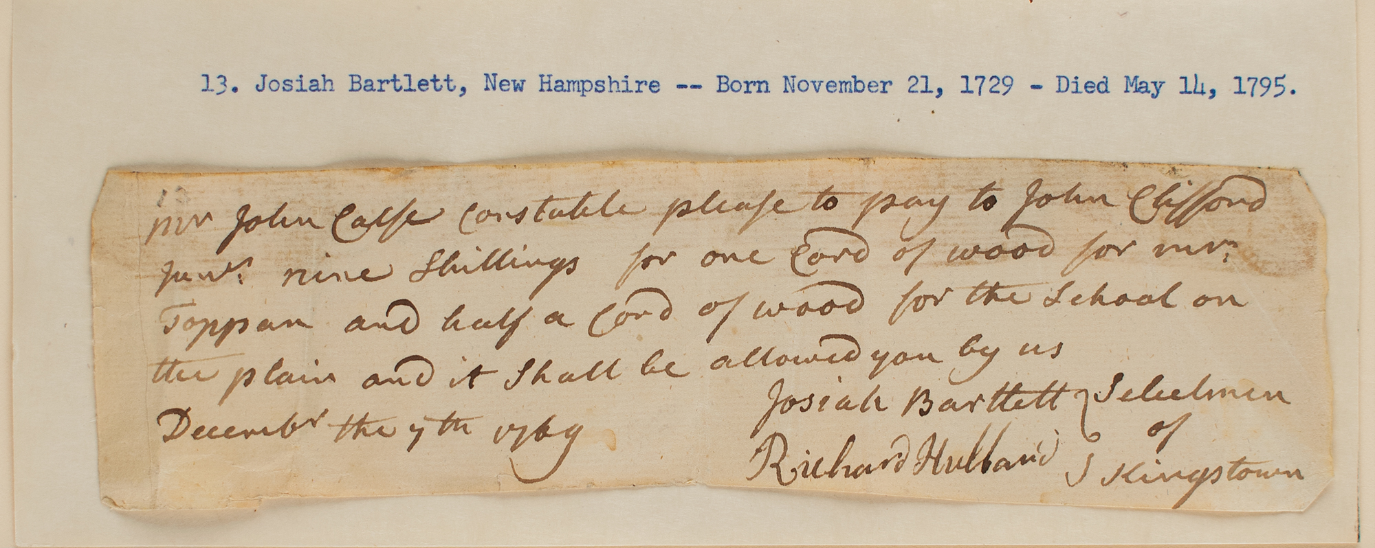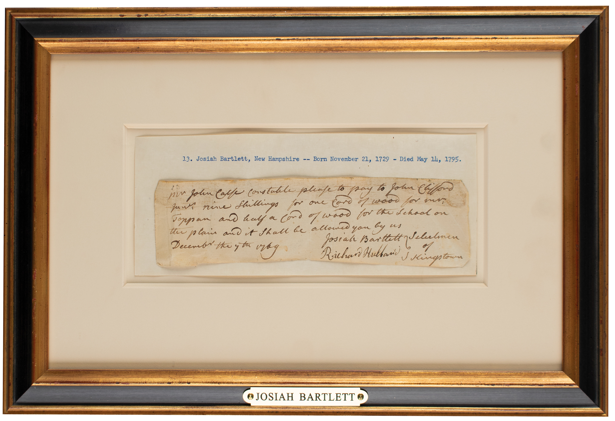 ADS, one page, 7.5 x 2, December 7, 1769. Handwritten document by Bartlett as a selectman of Kingston, New Hampshire, ordering payment "to John Clifford Jun'r nine shillings for one cord of wood for Mt. Toppan and half a cord of wood for the school on the plain." Signed at the conclusion by Josiah Bartlett and Richard Hubbard. Mounted to a larger sheet, matted, and framed to an overall size of 14.75 x 10. In very good to fine condition, with trimmed edges, creasing, and staining along the top edge.