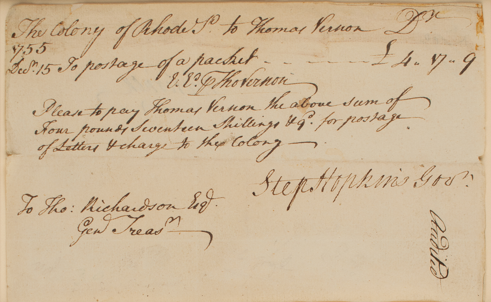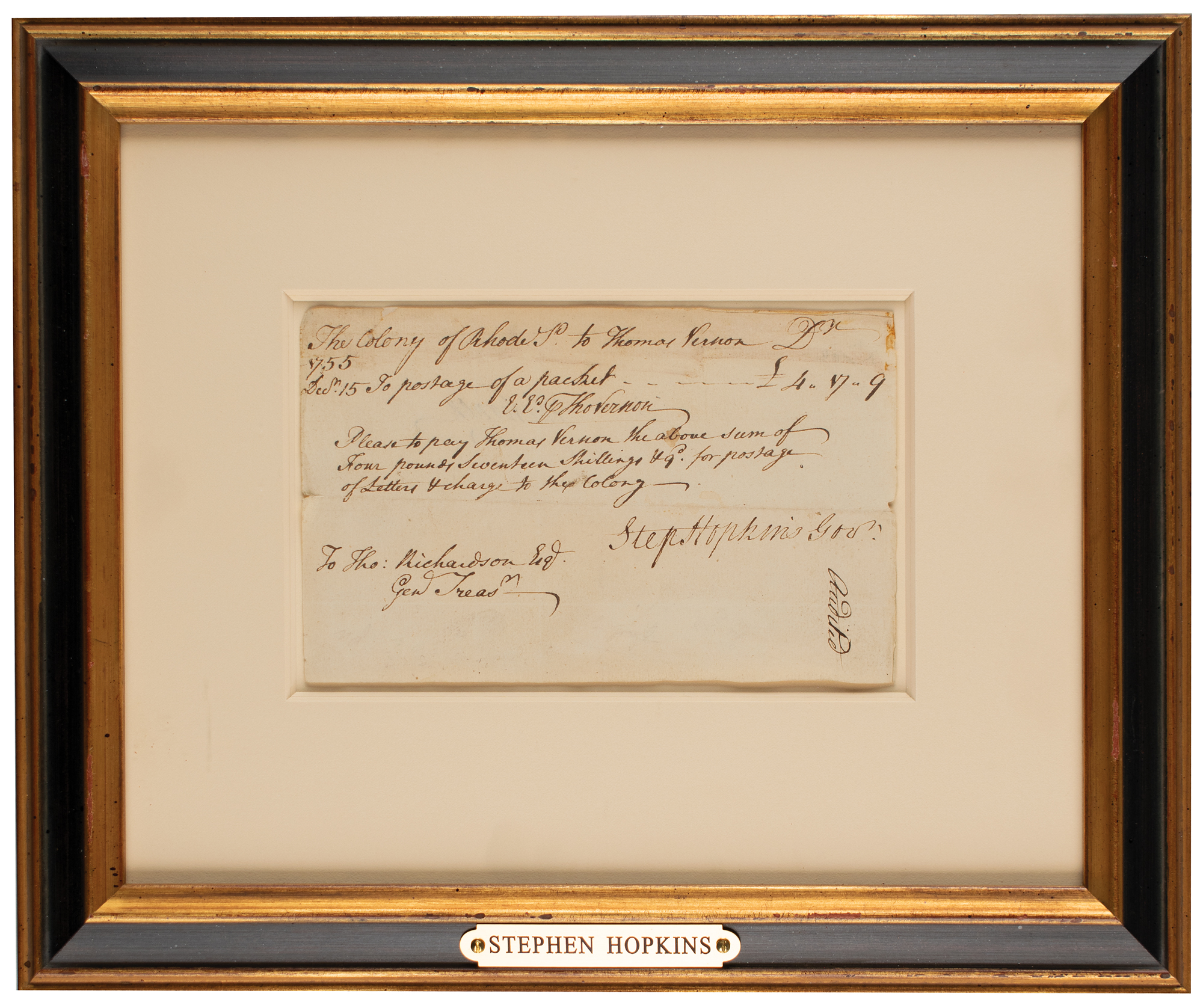 Signer of the Declaration of Independence from Rhode Island (1707-1785) who served as the colony's governor in the 1750s and 1760s. Manuscript DS, signed “Step. Hopkins, Gov'r,” one page, 6.5 x 4, December 15, 1755. Pay order issued to Thomas Richardson, the general treasurer of Rhode Island, directing him to pay unto Thomas Vernon the sum of "Four pounds Seventeen Shillings & 9d for postage of Letters & charge the Colony." Signed at the conclusion by Hopkins as the colonial governor of Rhode Island. Archivally mounted, matted, and framed to an overall size of 12.75 x 10.75. In very good to fine condition, with staining along the top edge.