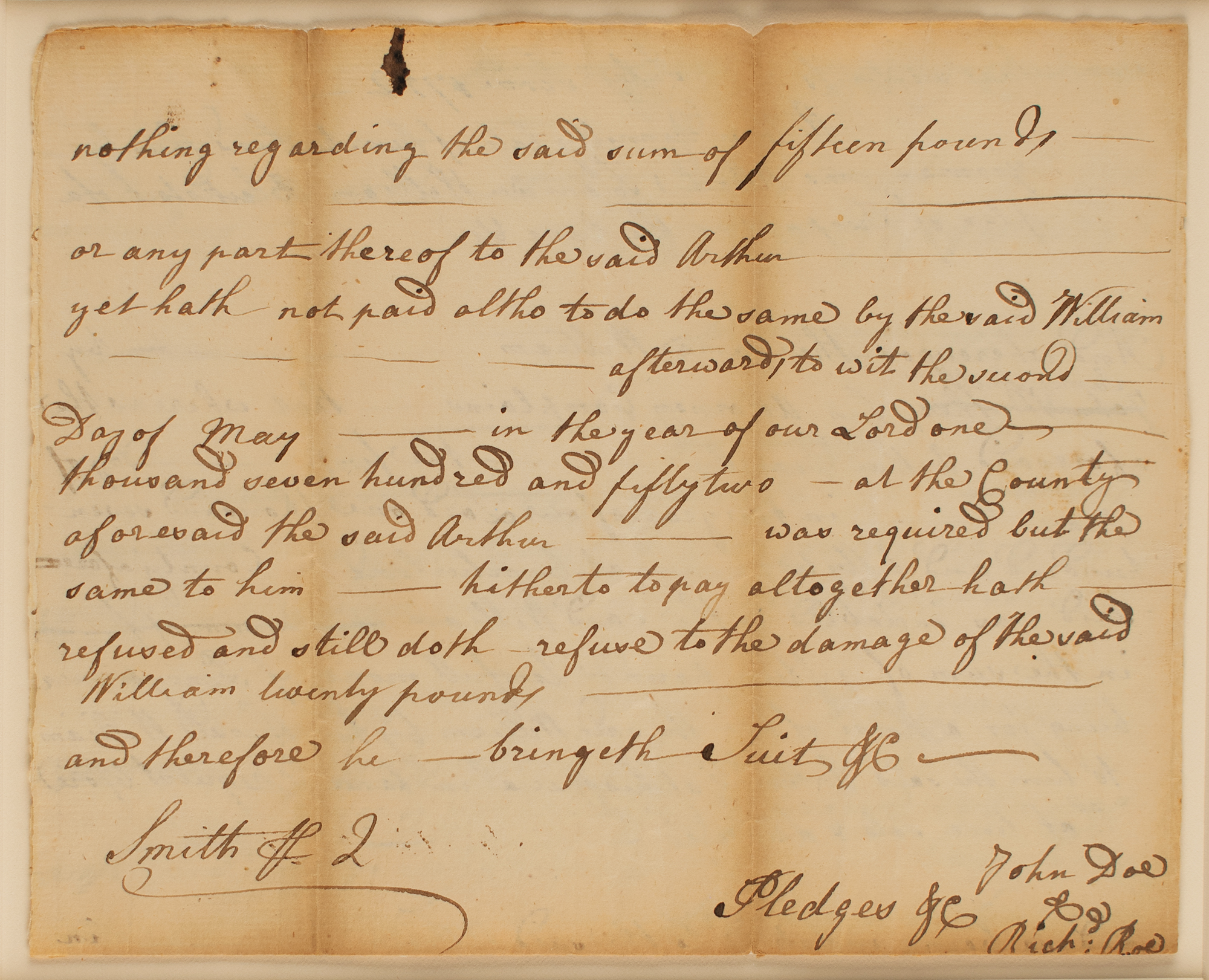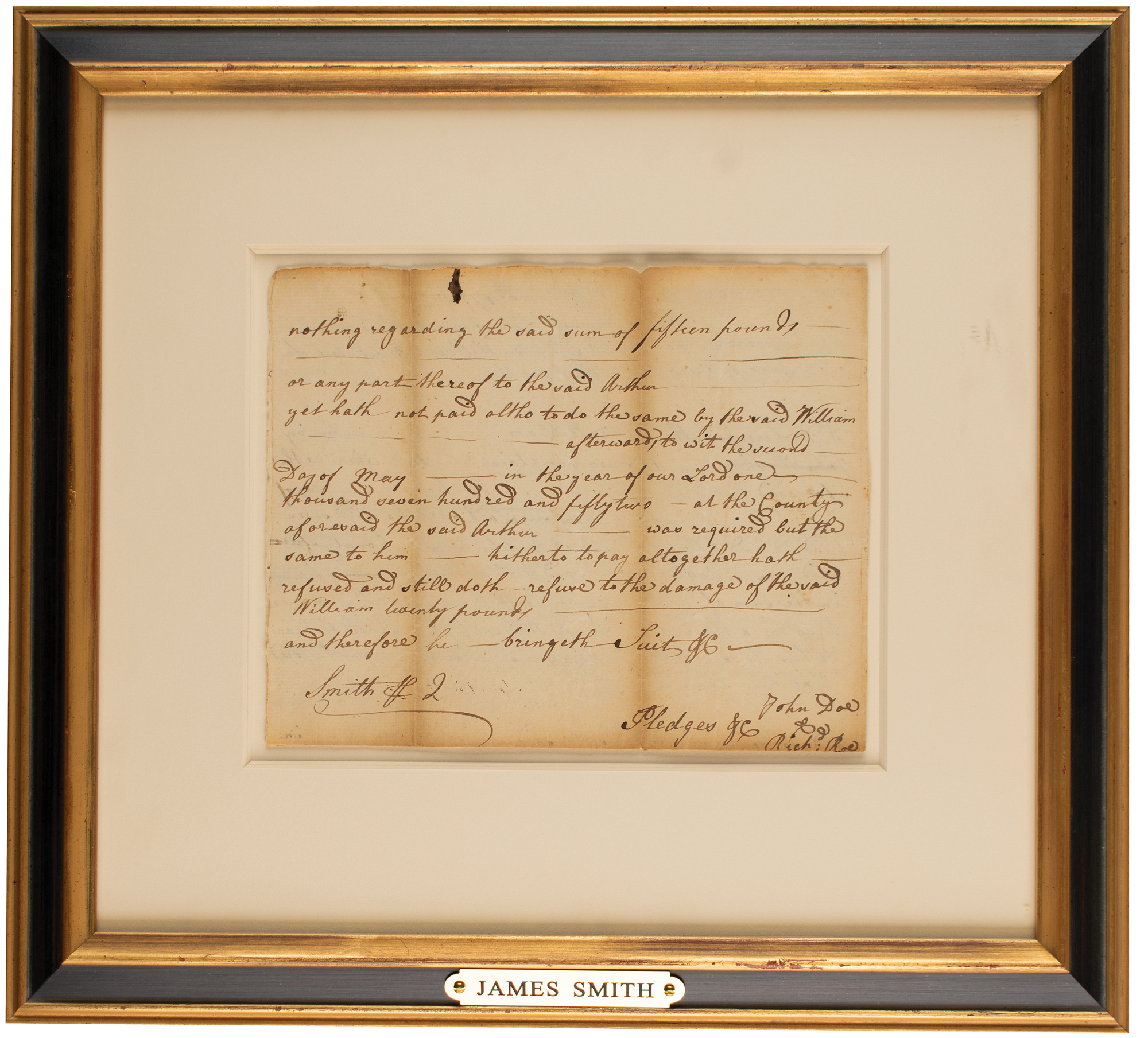 Signer of the Declaration of Independence from Pennsylvania (1719-1806). Manuscript DS, signed “Smith,” one page, 7.5 x 6, May 2, 1752. Final page of a legal document for "John Doe & Rich: Roe," regarding the refusal of paid debts and damages amounting to twenty pounds. Signed in the lower right by James Smith. Archivally mounted, matted, and framed to an overall size of 14.25 x 13. In very good to fine condition, with toning to the edges and folds.