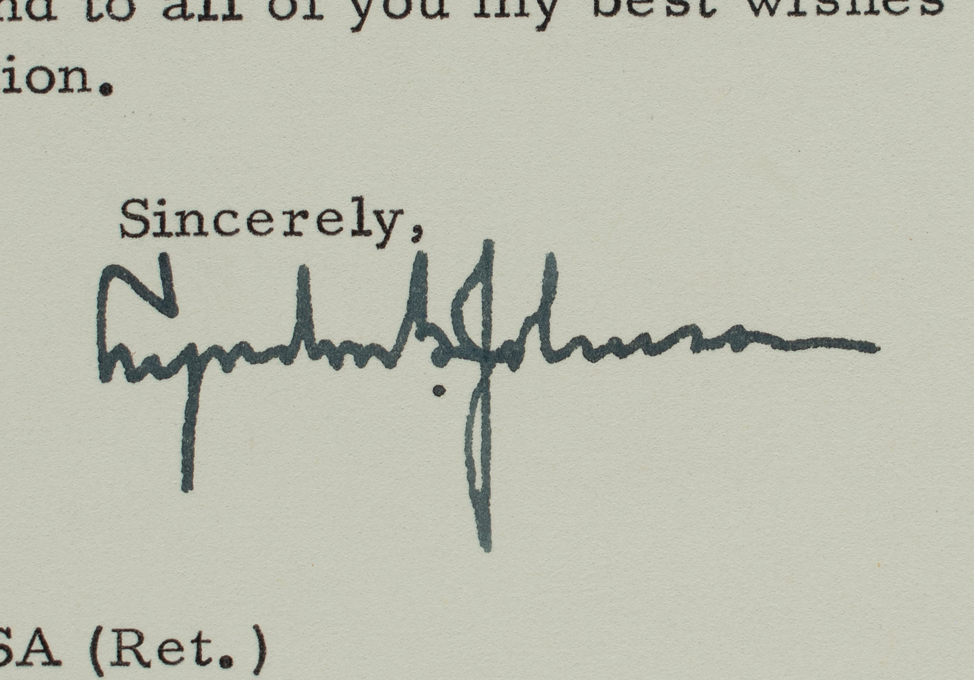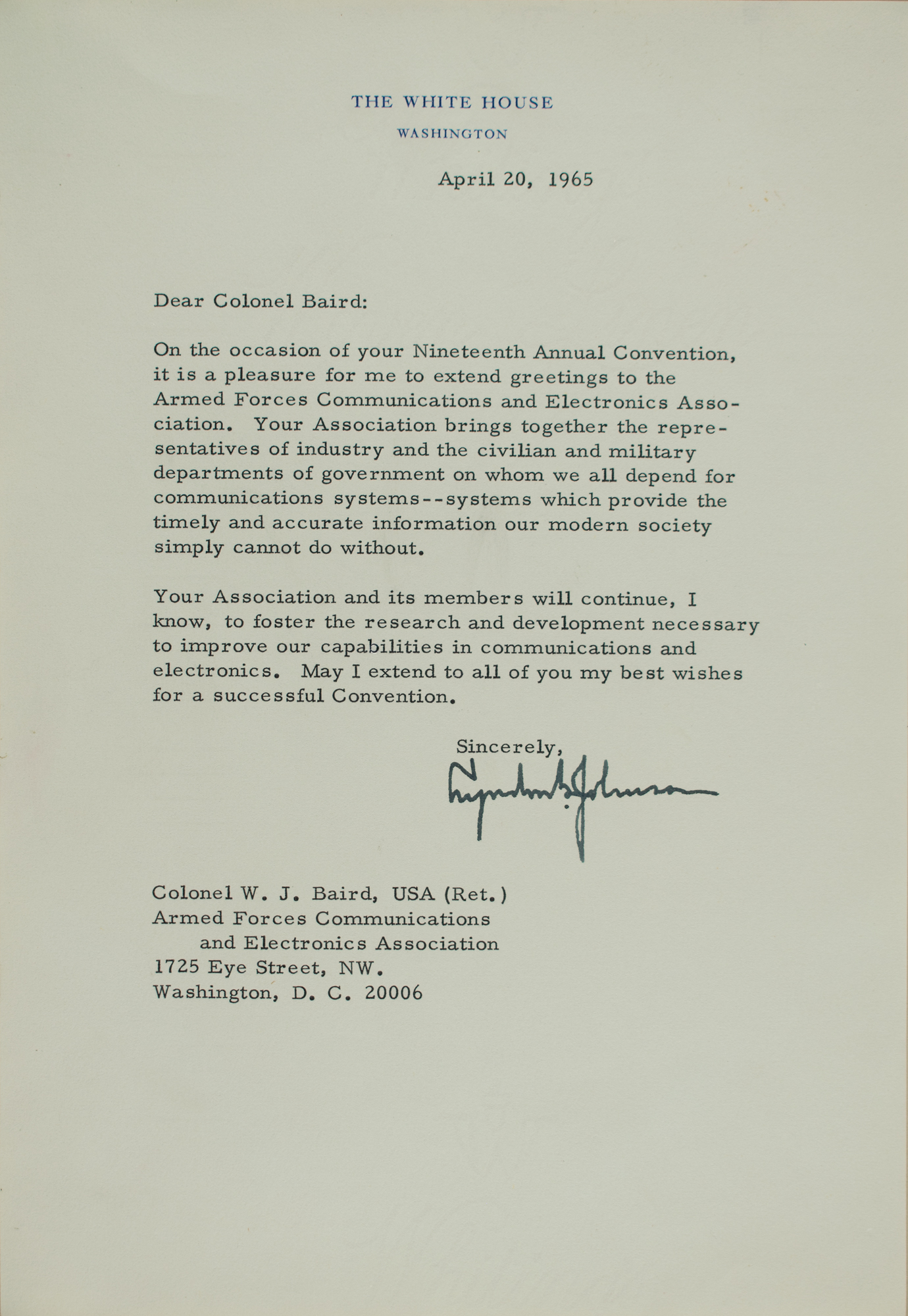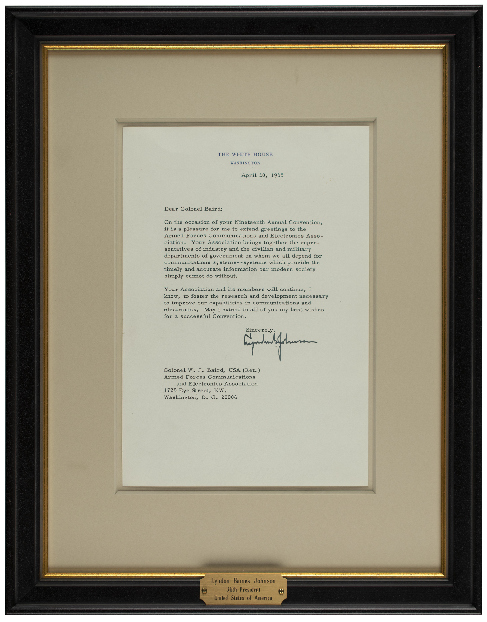 TLS as president, one page, 7 x 10.25, White House letterhead, April 20, 1965. Letter to Colonel W. J. Baird of the Armed Forces Communications and Electronics Association, in part: "On the occasion of your Nineteenth Annual Convention, it is a pleasure for me to extend greetings to the Armed Forces Communications and Electronics Association. Your Association brings together the representatives of industry and the civilian and military departments of government on whom we all depend for communications systems—systems which provide the timely and accurate information our modern society simply cannot do without. Your Association and its members will continue, I know, to foster the research and development necessary to improve our capabilities in communications and electronics. May I extend to all of you my best wishes for a successful Convention." Mounted, matted, and framed to an overall size of 13.5 x 17.25. In very fine condition. Accompanied by the original mailing envelope.