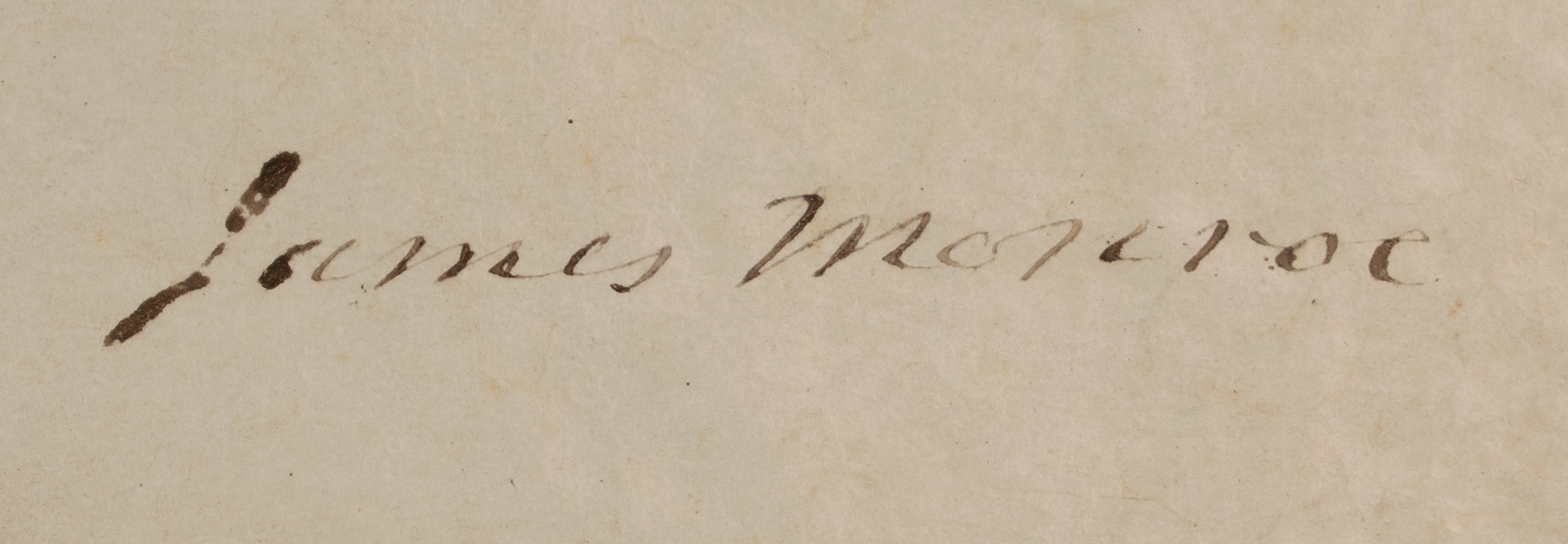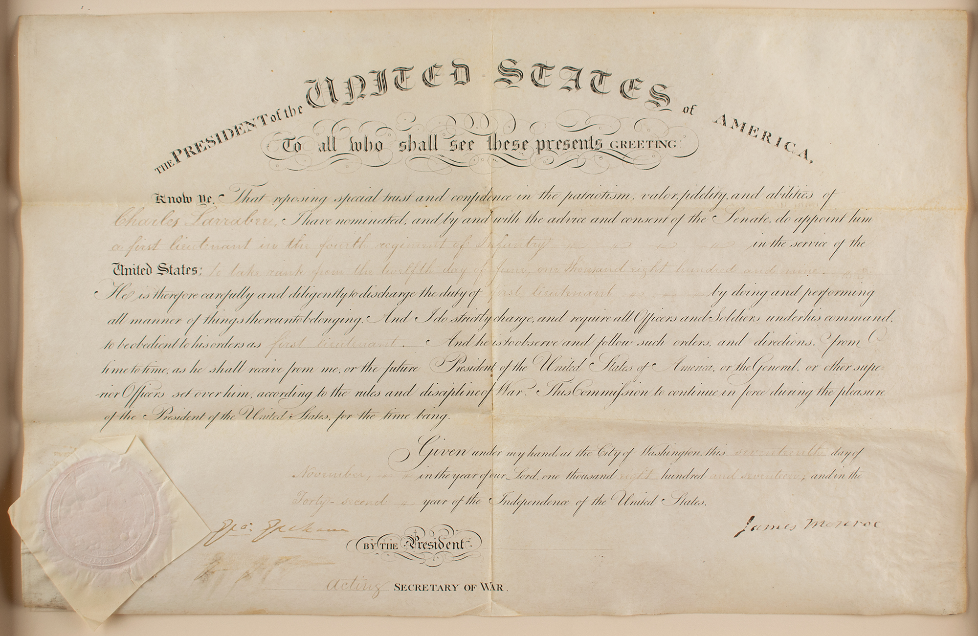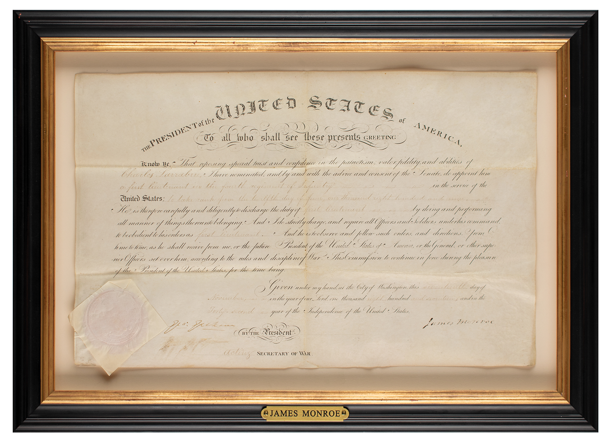 Partly-printed vellum DS as president, one page, 16 x 10.25, November 17, 1817. President Monroe appoints Charles Larrabee as "a first lieutenant in the fourth regiment of Infantry in the service of the United States." Signed at the conclusion by James Monroe, and countersigned by Acting Secretary of War George Graham. Original white paper seal remains affixed to the lower left. Archivally mounted and framed to an overall size of 20.25 x 14.5. In fine condition, with all of the handwriting, including the signature, light but legible.